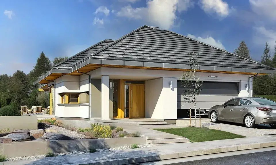 В отделке фасада используются контрастные материалы и цвета. Большая часть стен выполнена в белом цвете, а отдельные элементы облицованы материалом, напоминающим коричневый кирпич или плитку. Это создает динамичный и визуально интересный облик.