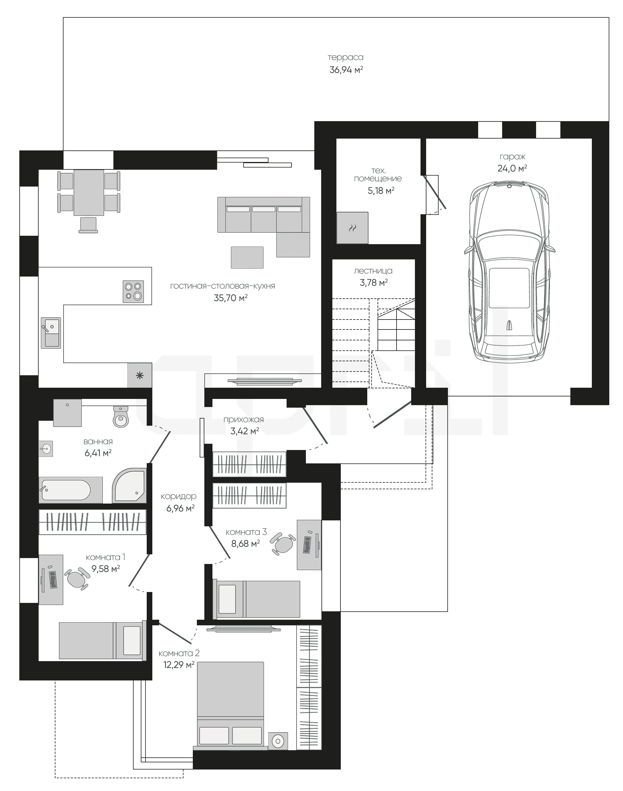 Дом с современным дизайном с плоской крышей и большими окнами. Архитектура дома предполагает наличие балкона на втором этаже и террасу.