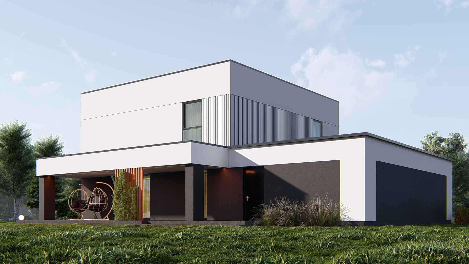 Проект представляет собой современный двухэтажный дом в минималистическом стиле Хайтек. Характерные черты дома включают плоскую крышу, большие окна и чистые линии.