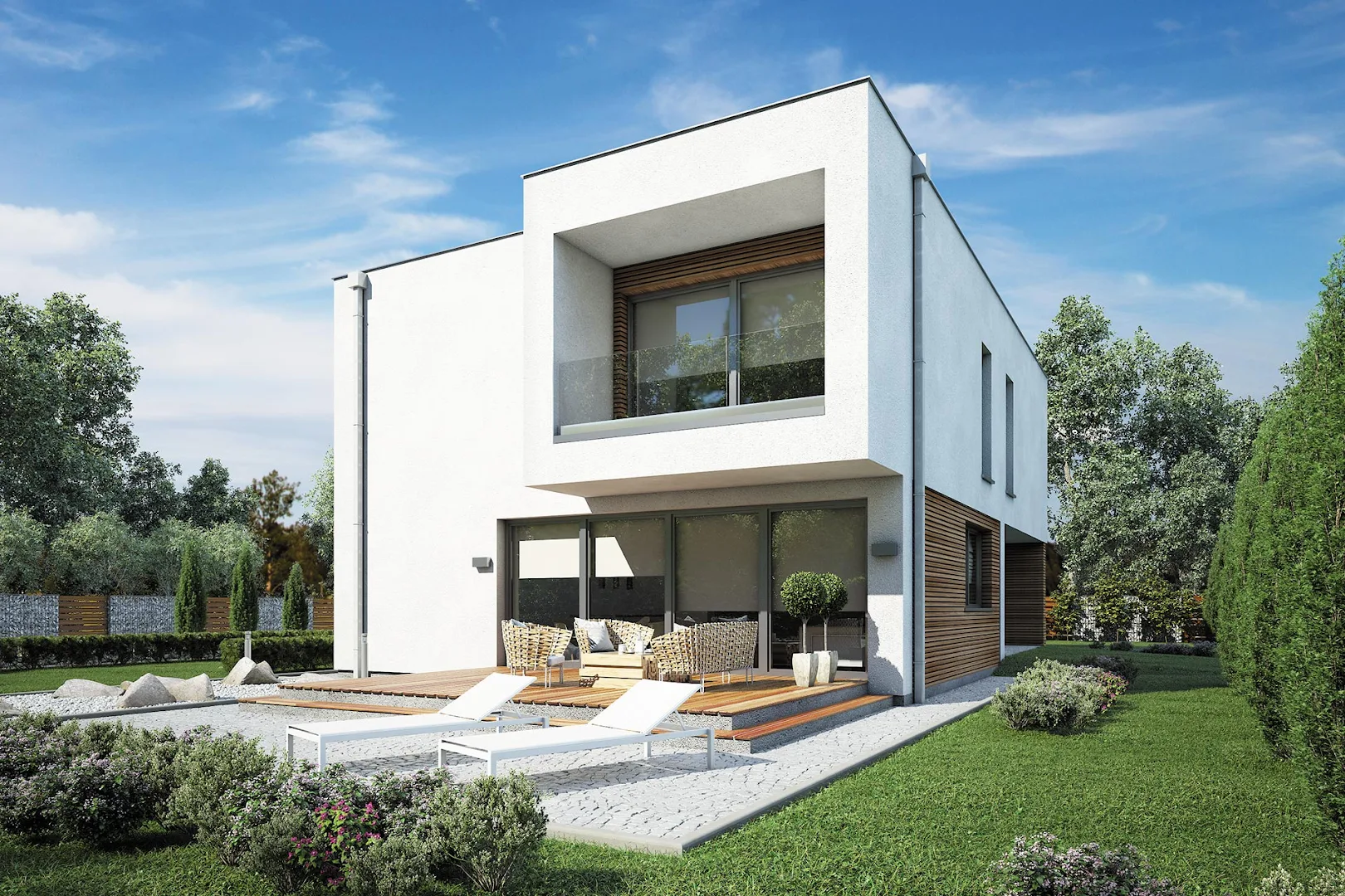 Фасад комбинирует отделку, включающую белую штукатурку и элементы деревянной облицовки.