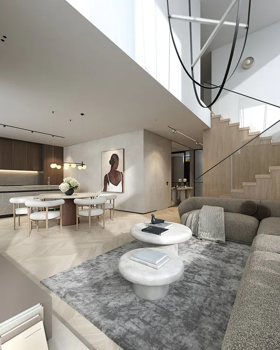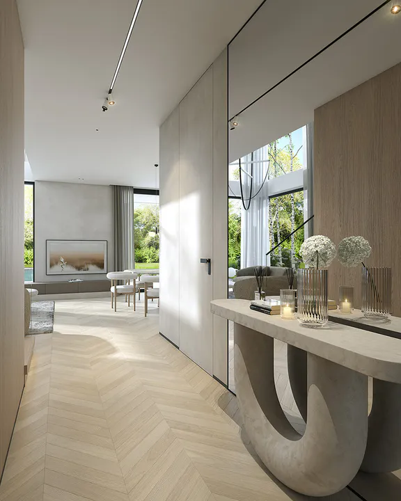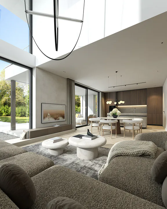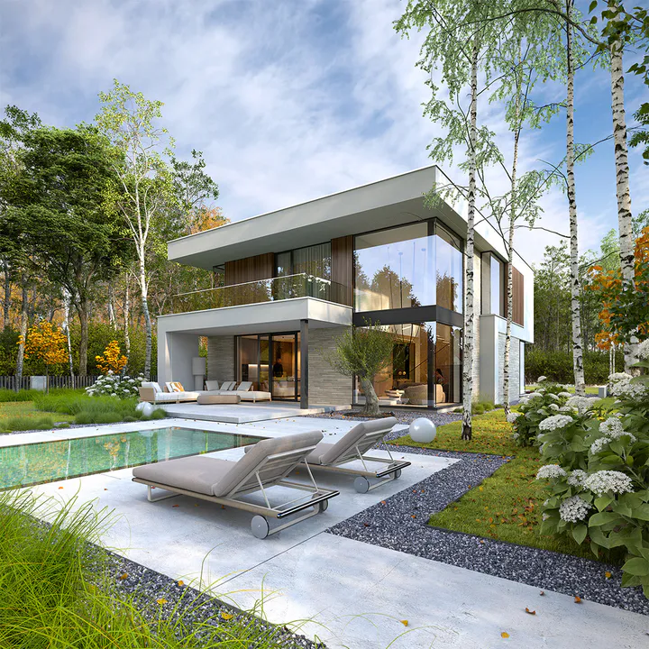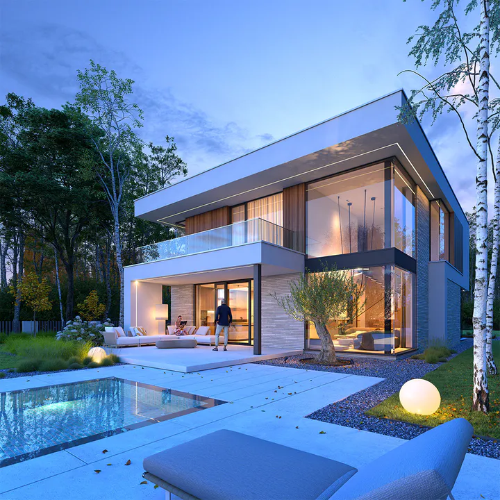 Дизайн дома характеризуется чистыми линиями, большими панорамными окнами и минималистичным дизайном.