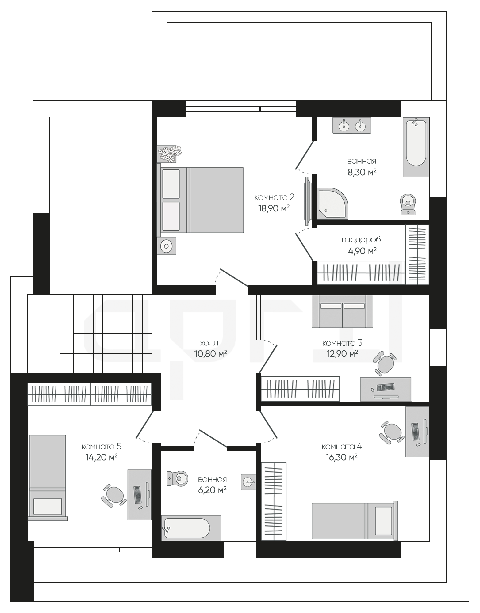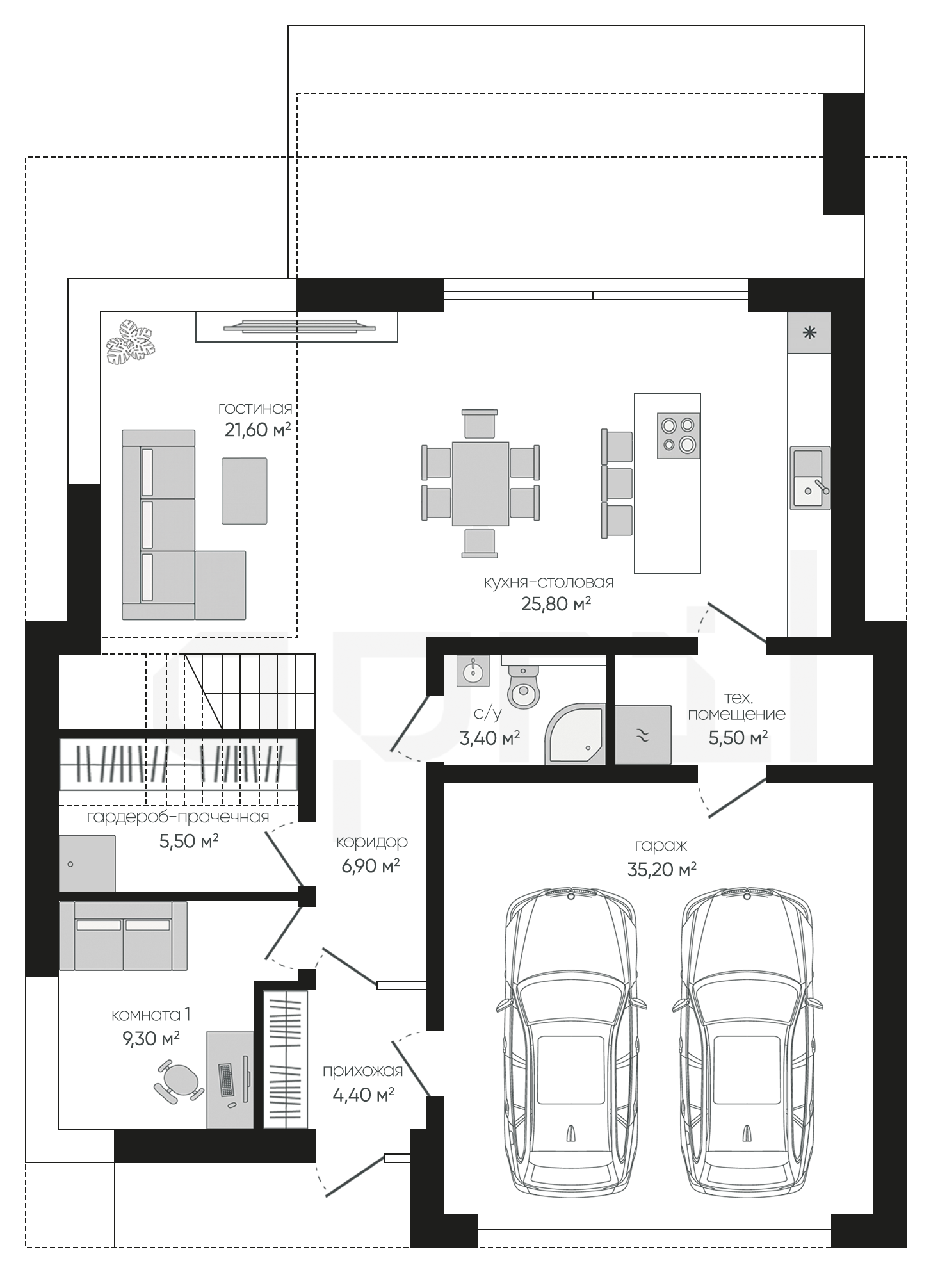 Крыша в проекте, с углом наклона 30°, обеспечивает хороший баланс между эффективным отводом осадков и созданием гармоничного современного внешнего вида здания.