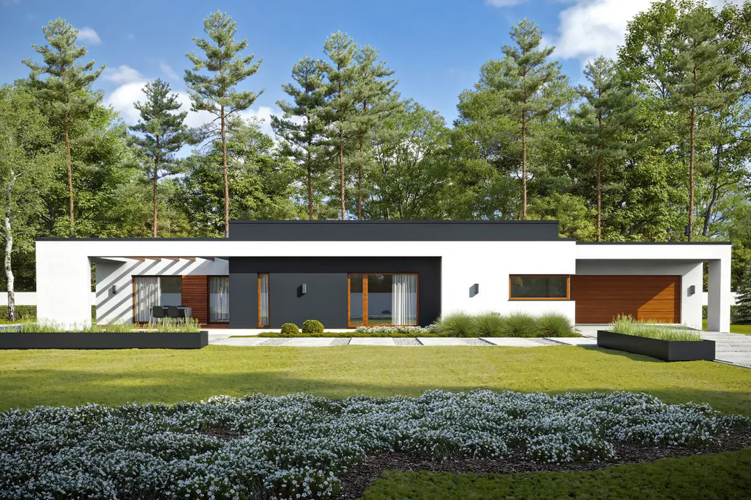 Проект одноэтажного дома в стиле Хайтек с плоской крышей.