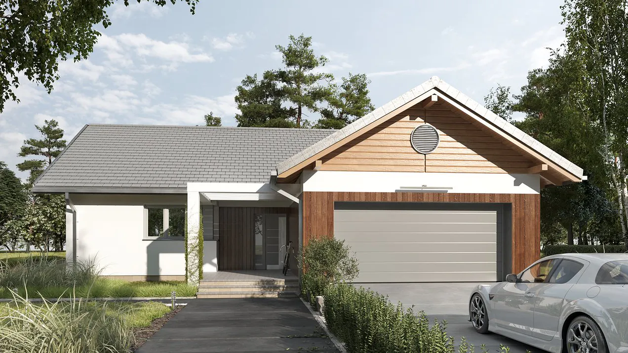 Проект включает обширный гараж и террасу, частично защищенную навесом, что расширяет функциональное пространство дома на прилегающую территорию.