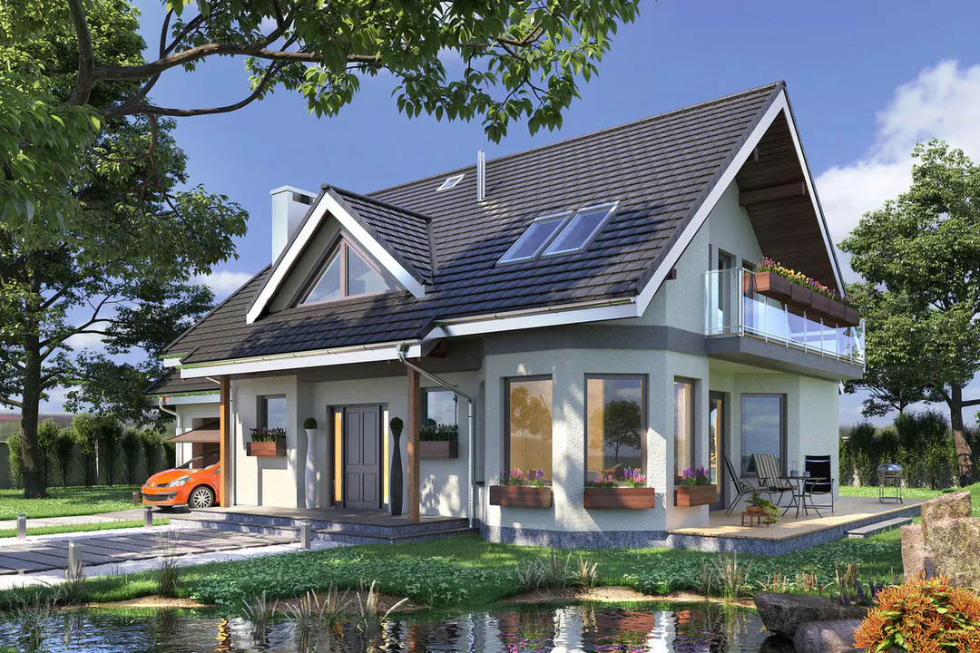 Проект современного двухэтажного дома в стиле Хайтек с плоской крышей, гаражом и навесом.