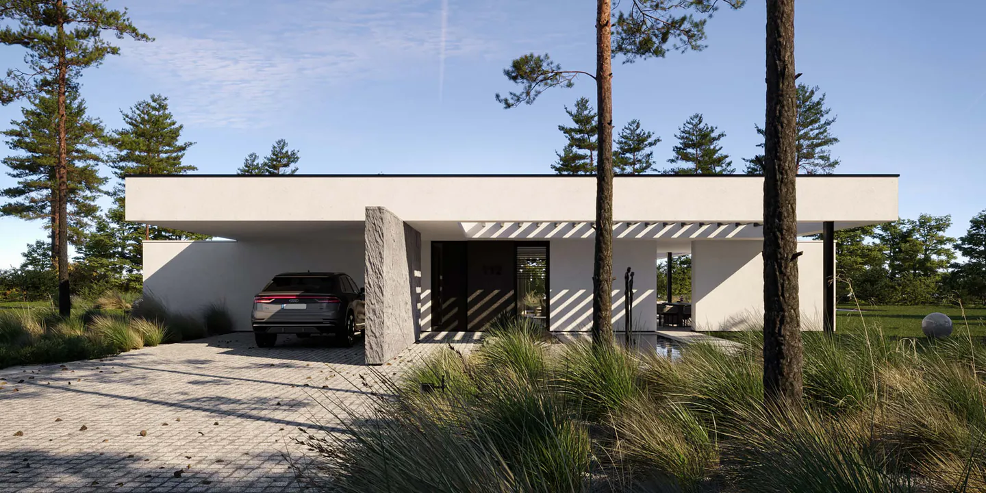 Дом имеет чистые линии, плоскую крышу и минималистичный дизайн.