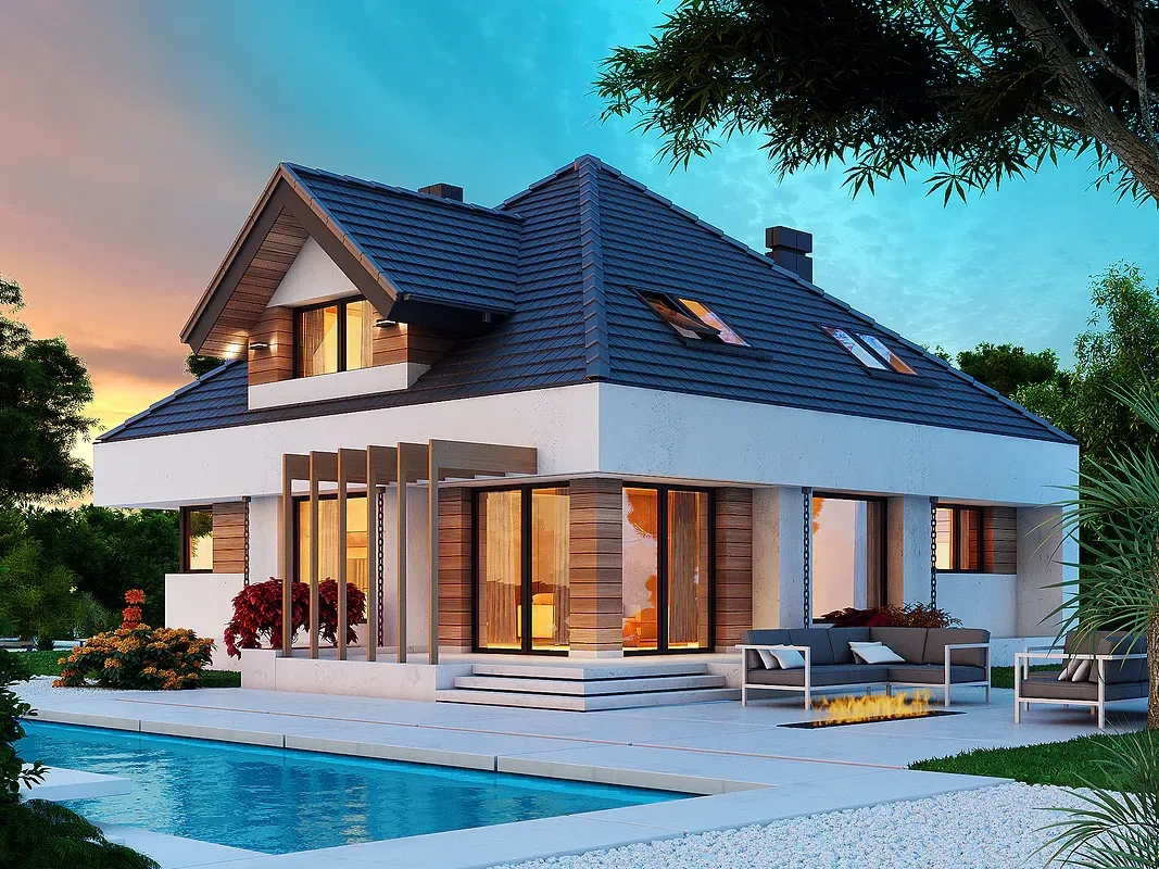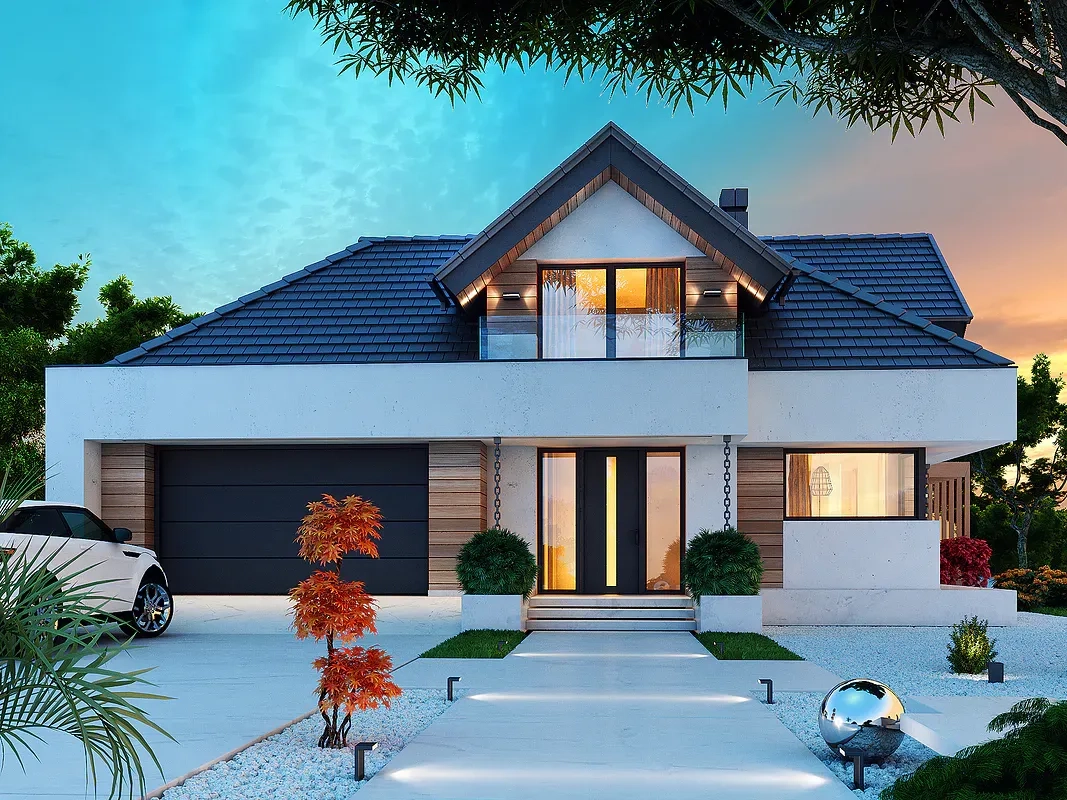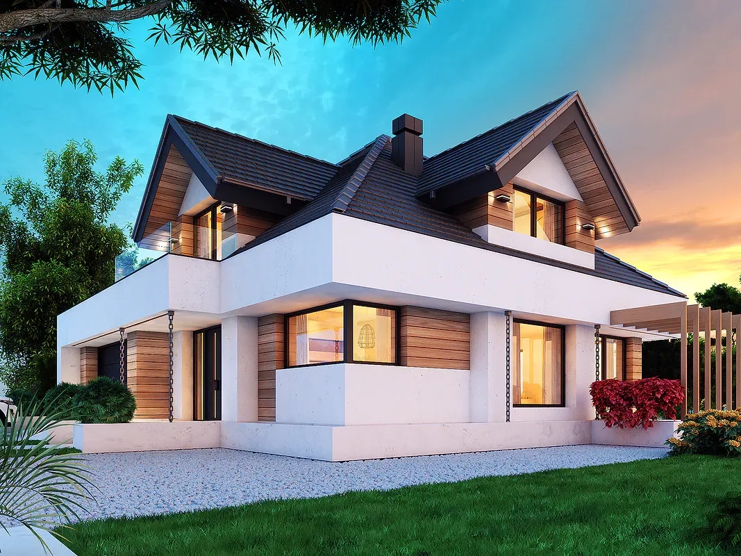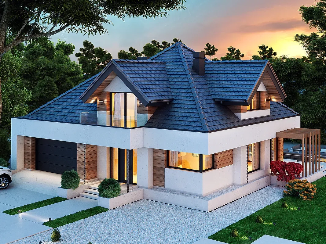 Дом имеет комбинированный фасад, где белая штукатурка сочетается с деревянными панелями. Фасад дома также украшен большими окнами, через которые проникает много естественного света внутрь помещения. Кровля дома выполнена из темной черепицы, что создает элегантный контраст с более светлыми стенами.