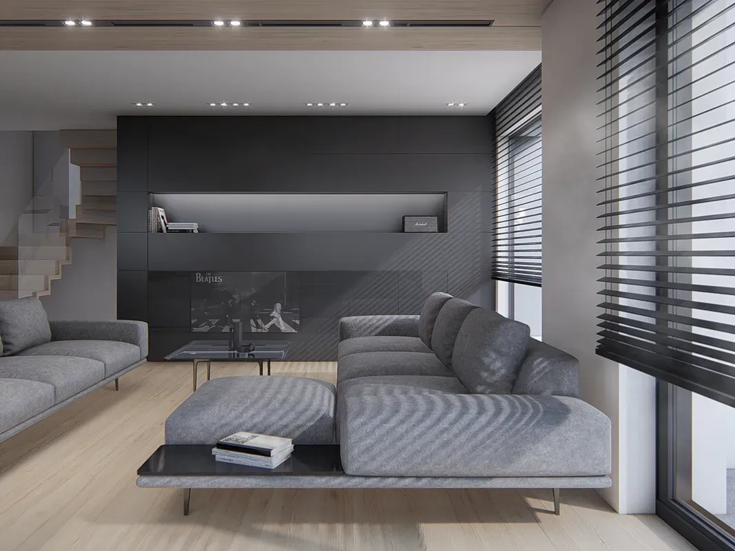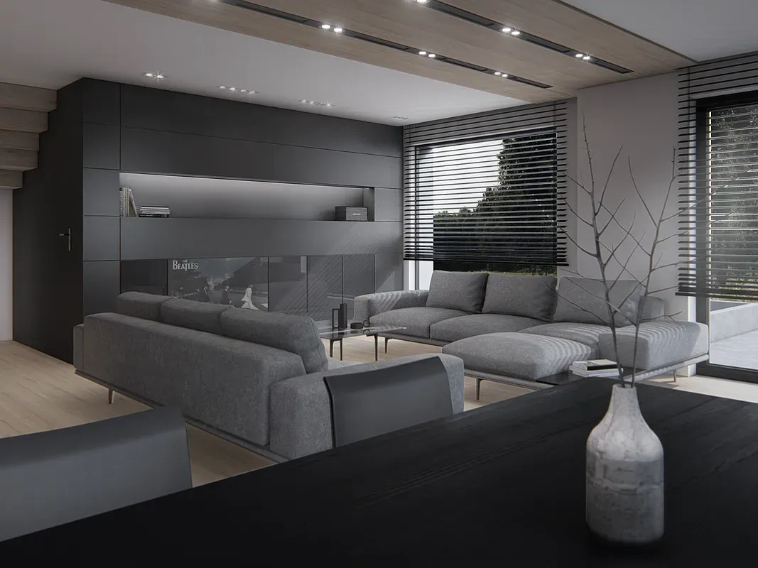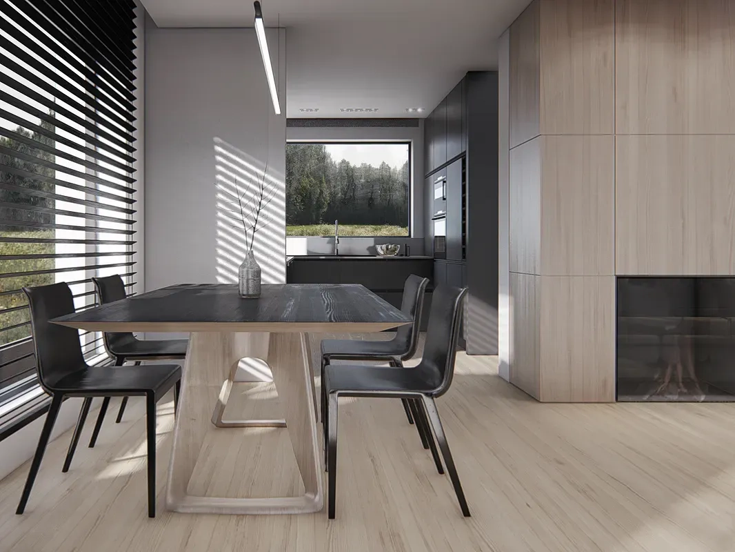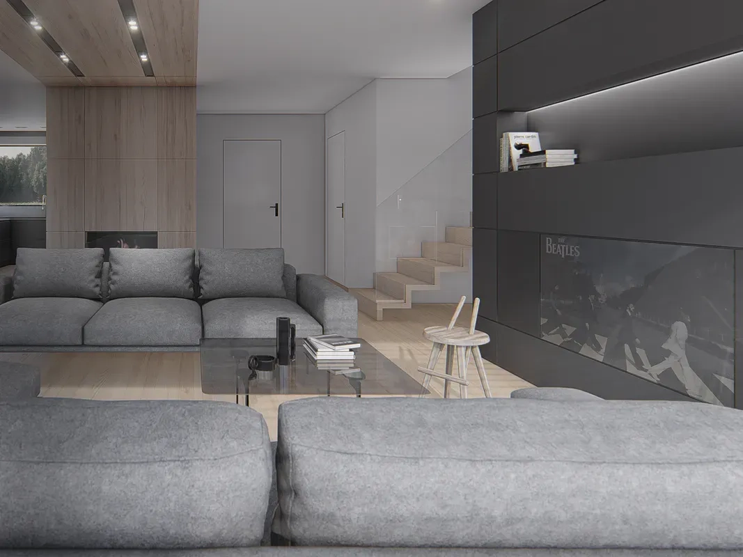 Дом имеет комбинированный фасад, где белая штукатурка сочетается с деревянными панелями. Фасад дома также украшен большими окнами, через которые проникает много естественного света внутрь помещения. Кровля дома выполнена из темной черепицы, что создает элегантный контраст с более светлыми стенами.
