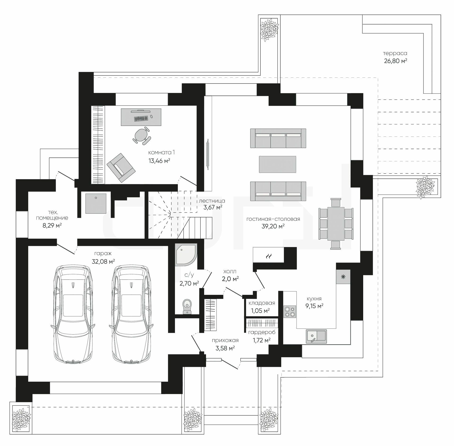 Дома 1 этаж с гаражом и террасой