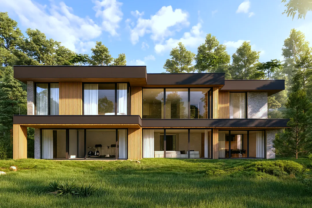 Большие окна и плоская крыша являются характерными элементами дизайна.