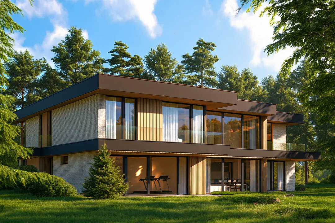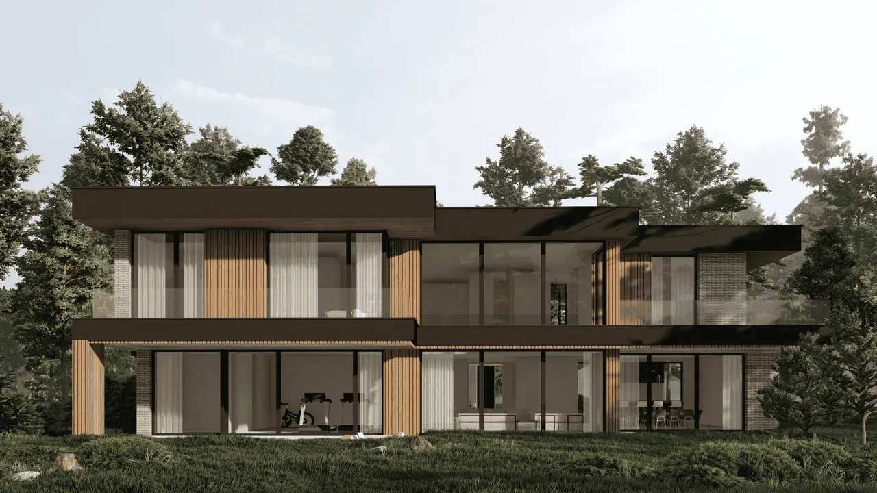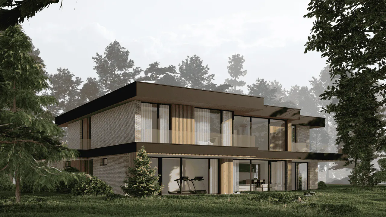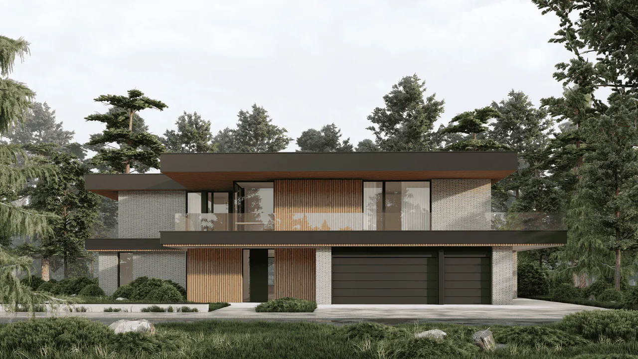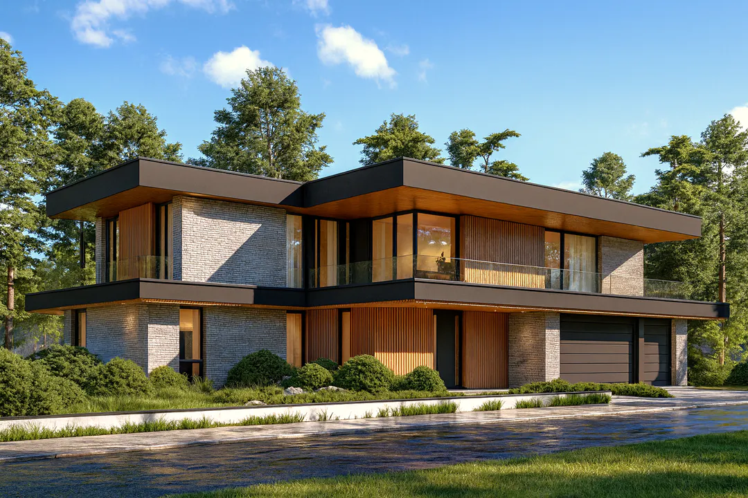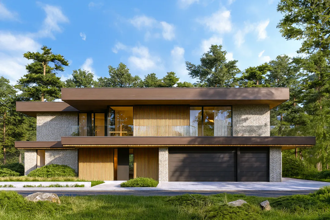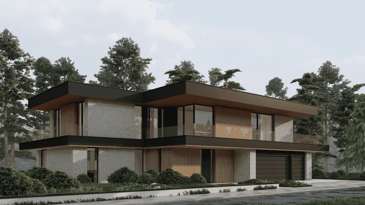 Внешний вид дома спроектирован в современном стиле Хайтек с использованием комбинации материалов, включая кирпич светлого оттенка и деревянную отделку.