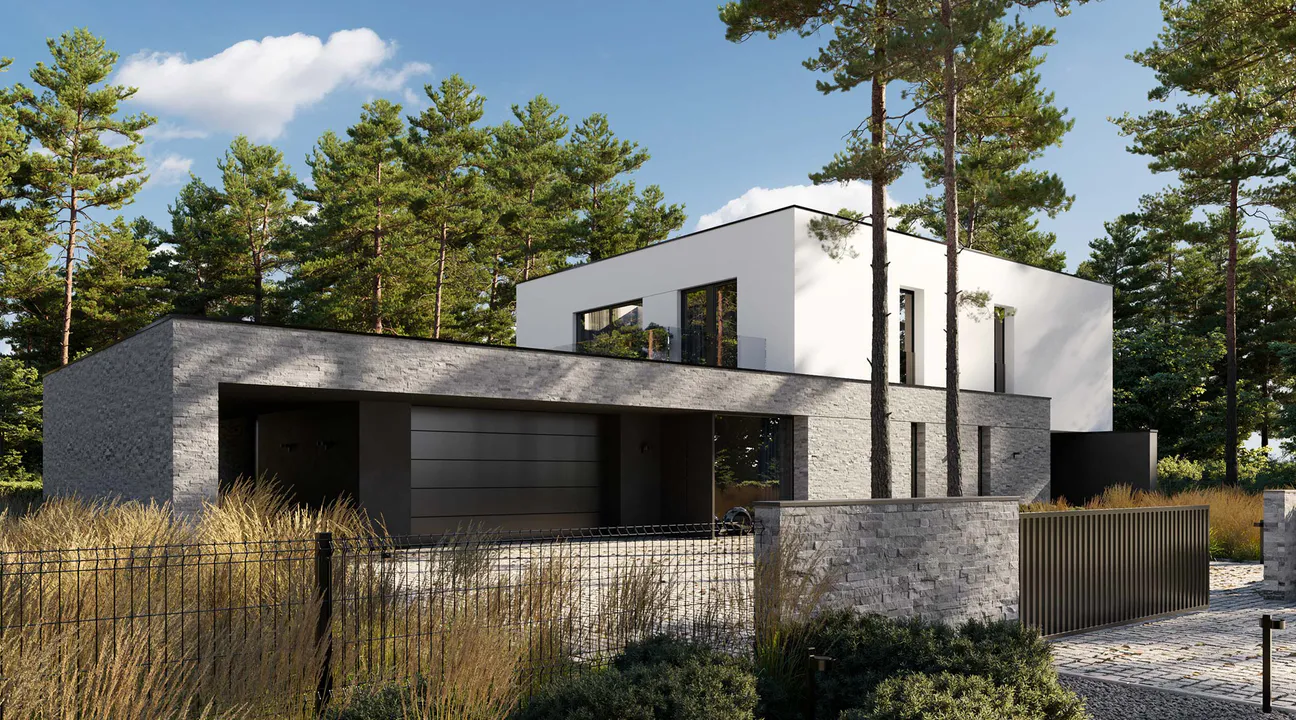 Сочетание плоской кровли, панорамного остекления и премиальных материалов создает актуальный, «вне времени», облик.