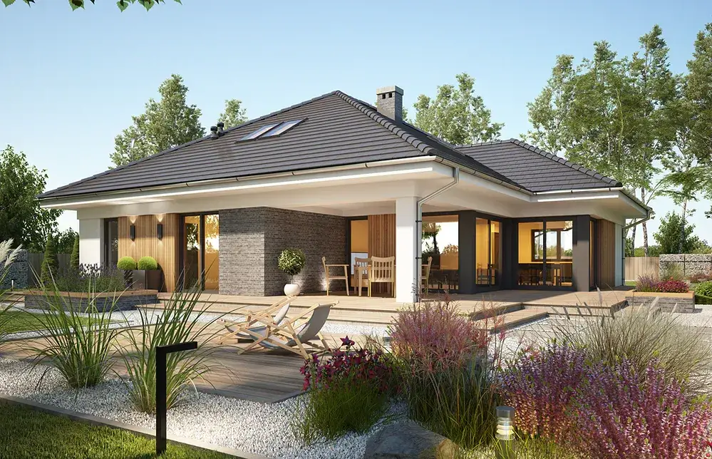 Проект имеет большие панорамные окна в гостиной зоне и крытую террасу, что обеспечивает обилие естественного света и визуально объединяет внутреннее и внешнее пространство.