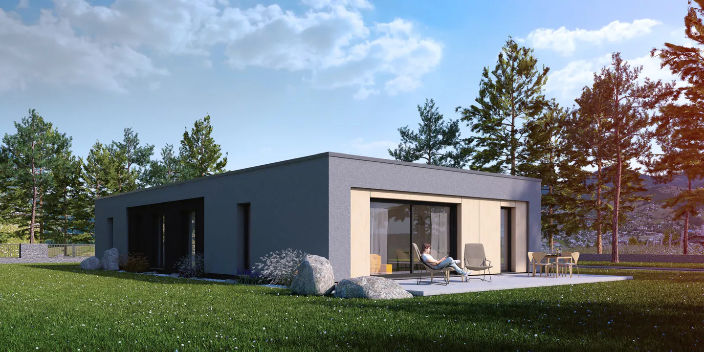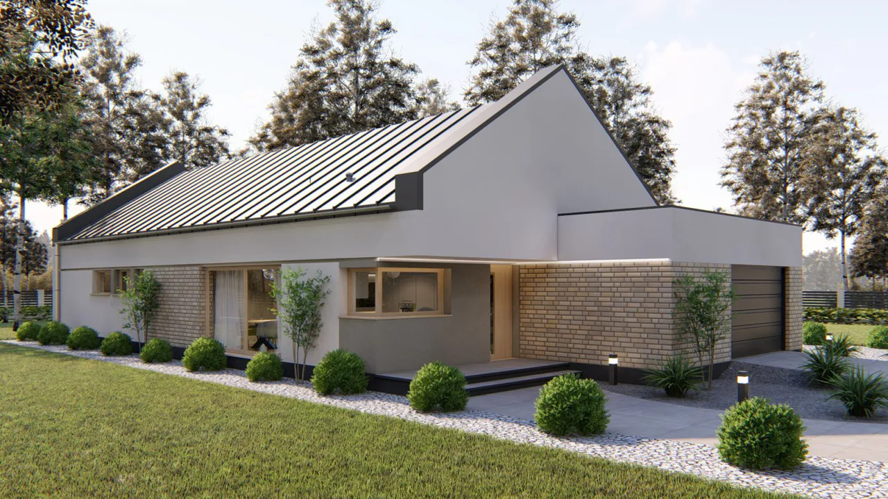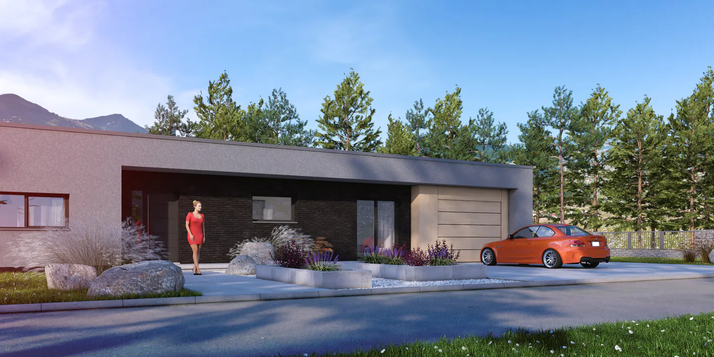 Проект современного одноэтажного дома с плоской крышей и интегрированным гаражом.