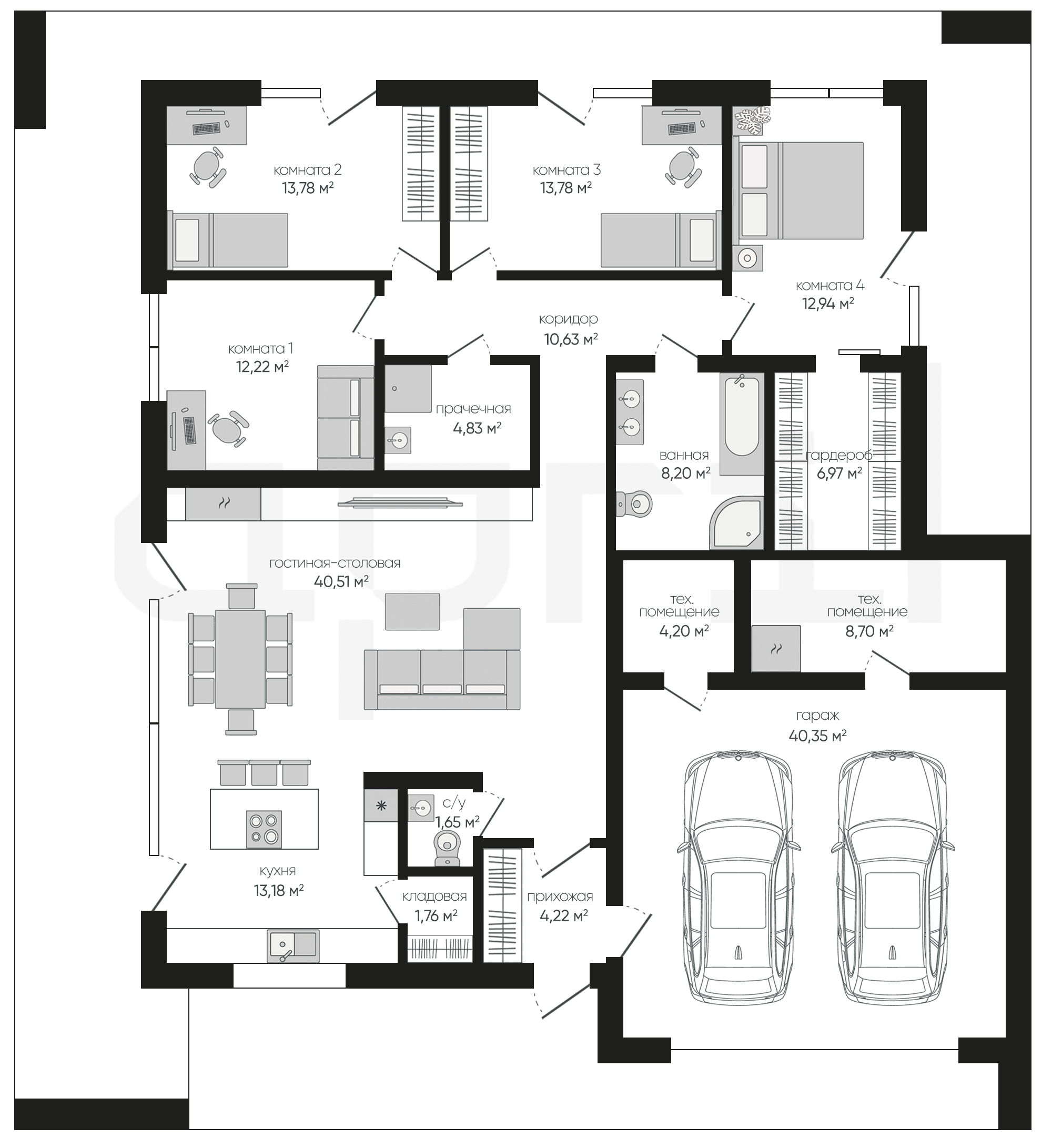 Главное преимущество дома — безупречное зонирование: активное пространство гостиной с камином и технологичной кухней четко отделено от приватного спального блока.