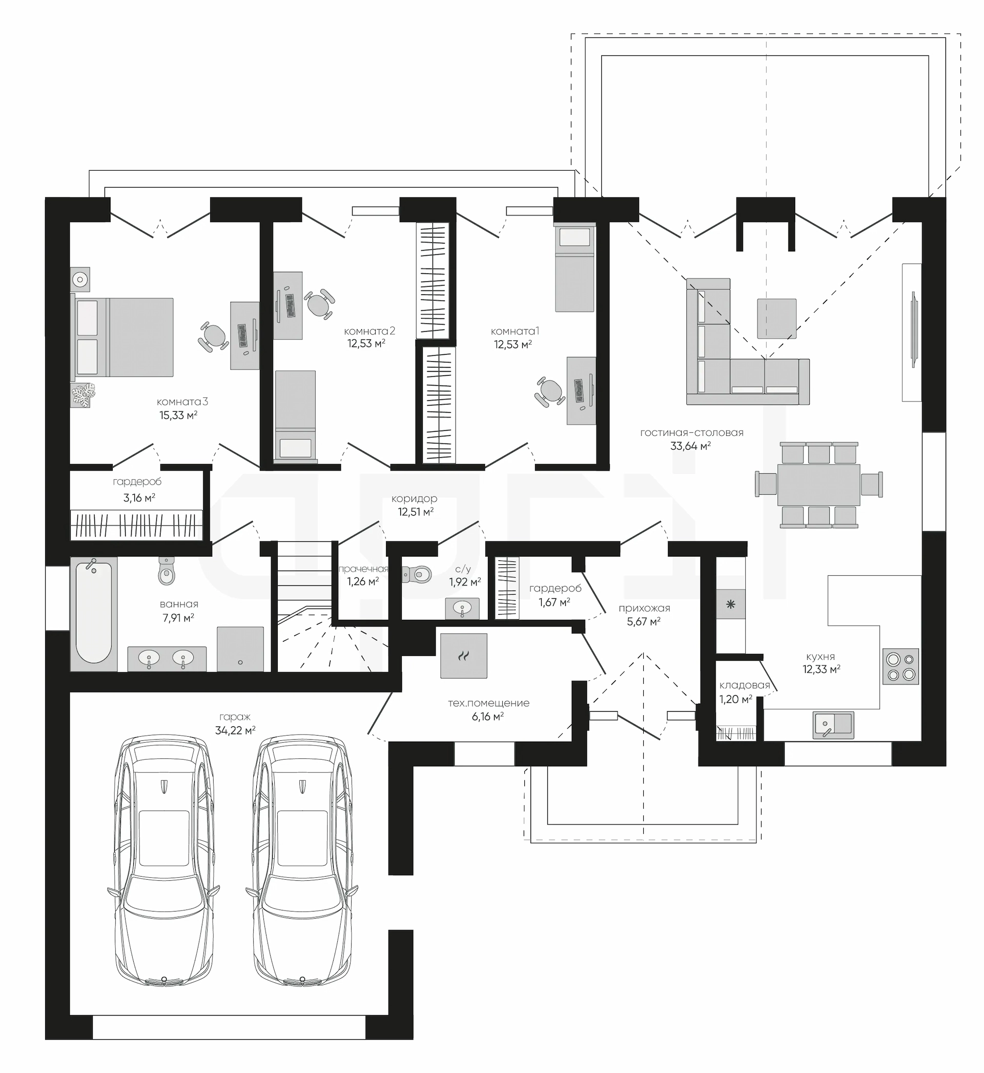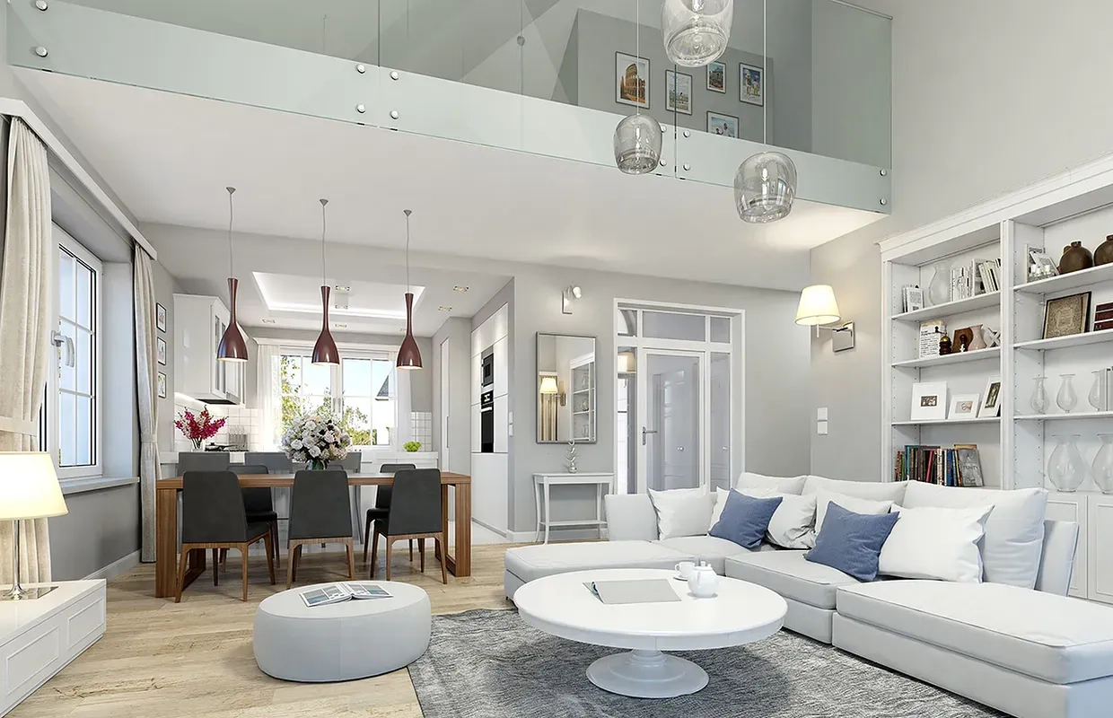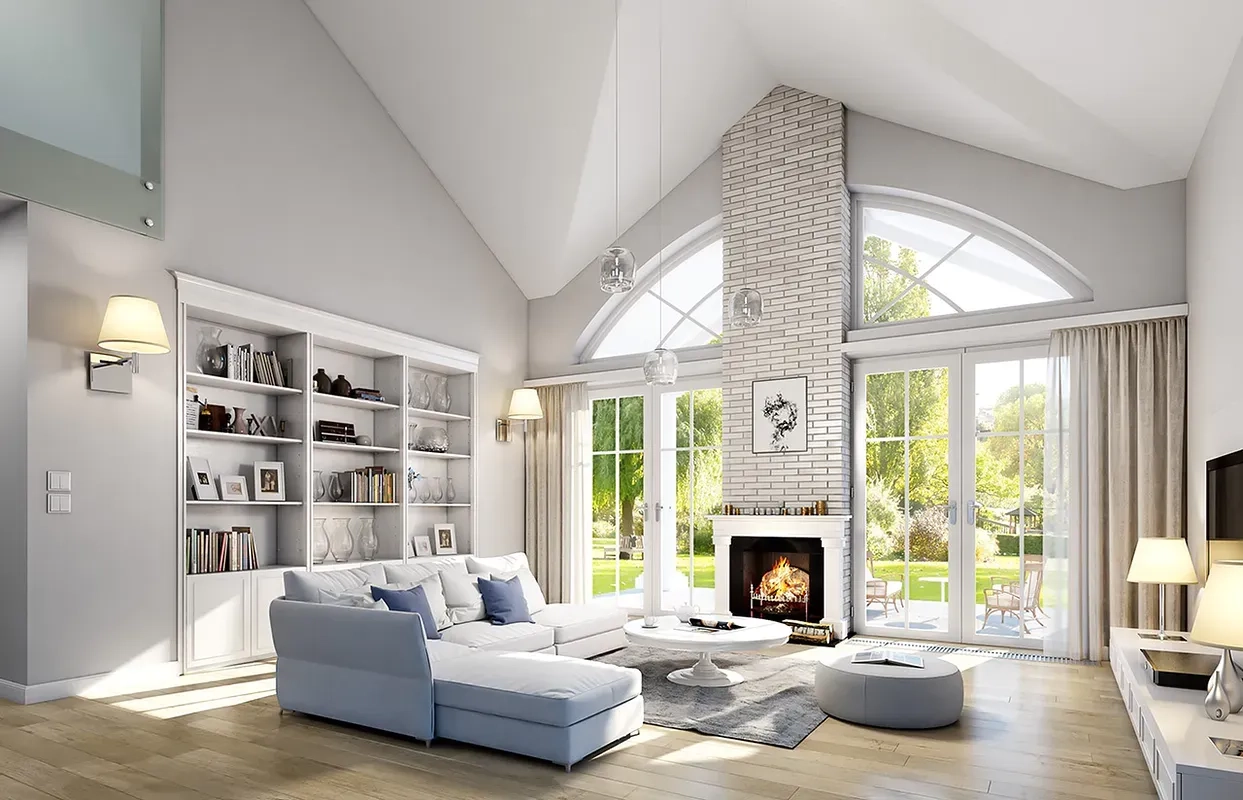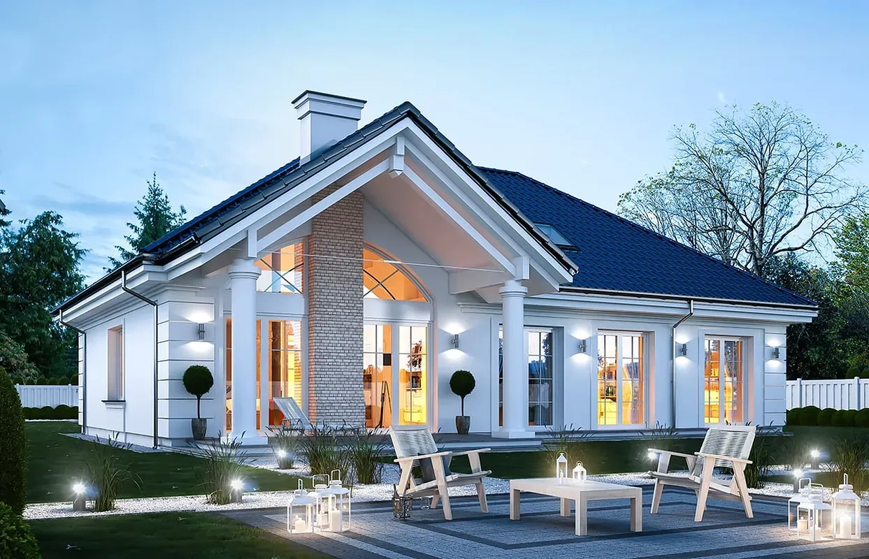 Архитектура дома сочетает в себе элементы классического традиционного дизайна с современными атрибутами комфортного проживания, делая его удобным местом для жизни современной семьи.