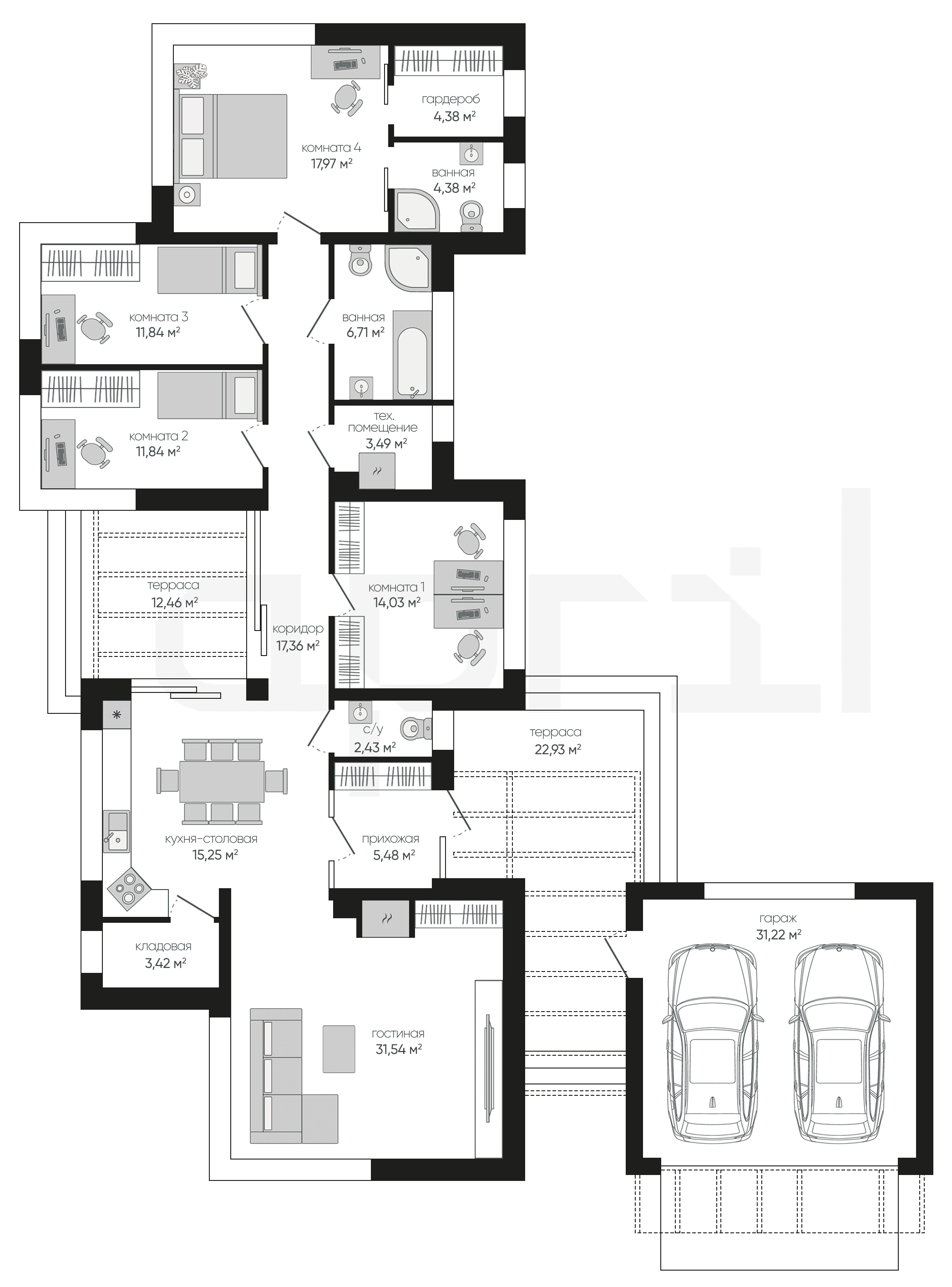 Фасад дома притягивает взгляд своей элегантностью и использованием натуральных материалов. Большая часть облицована камнем серого цвета, что придает зданию основательность, текстуру и монументальный внешний вид. Этот контраст смягчается вставками из деревянной обшивки, добавляющими тепла, уюта и гармонии с окружающей средой.