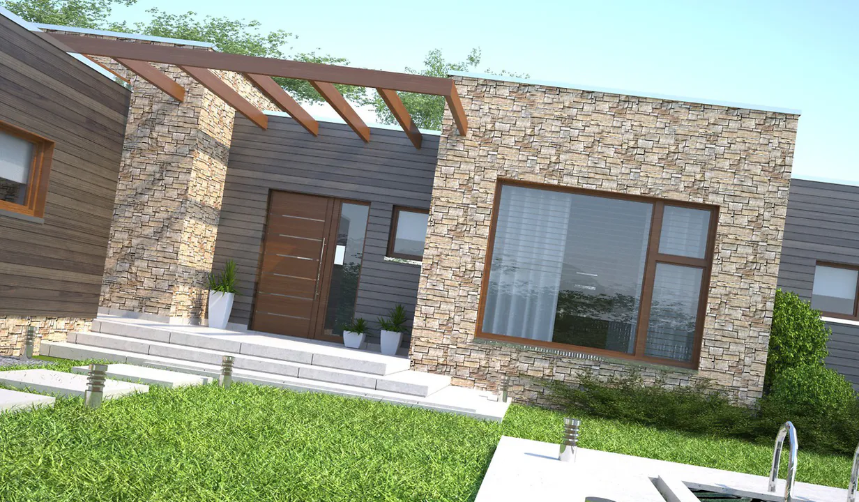 Использование натуральных материалов, таких как камень и дерево, в интерьере дома, наряду с панорамным остеклением, подчеркивает связь с природой, что является современным решением.