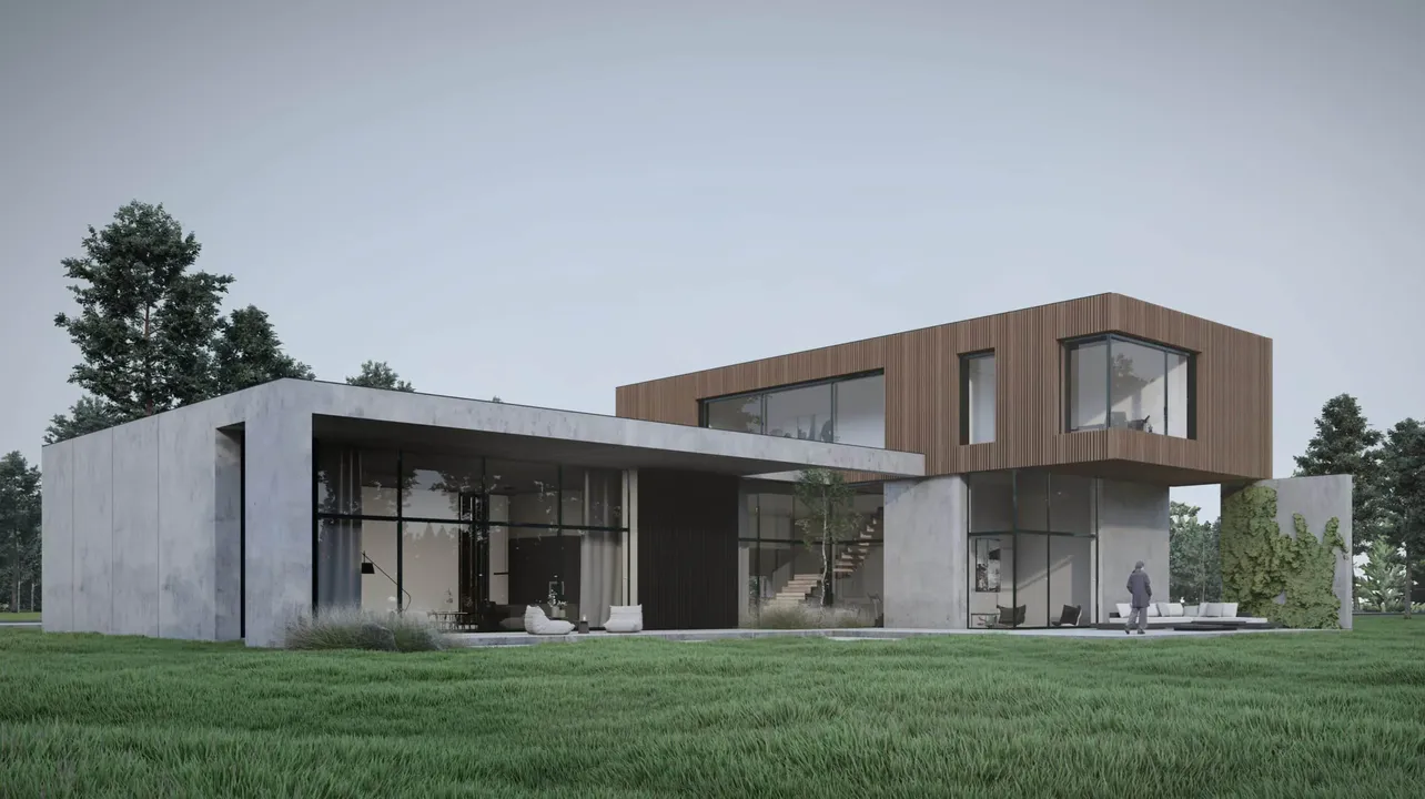 Фасадное решение строится на контрасте фактур: грубого необработанного бетона и натурального дерева. Вертикальные деревянные рейки улучшают теплотехнические характеристики стен и формируют ритмичный рисунок фасада.