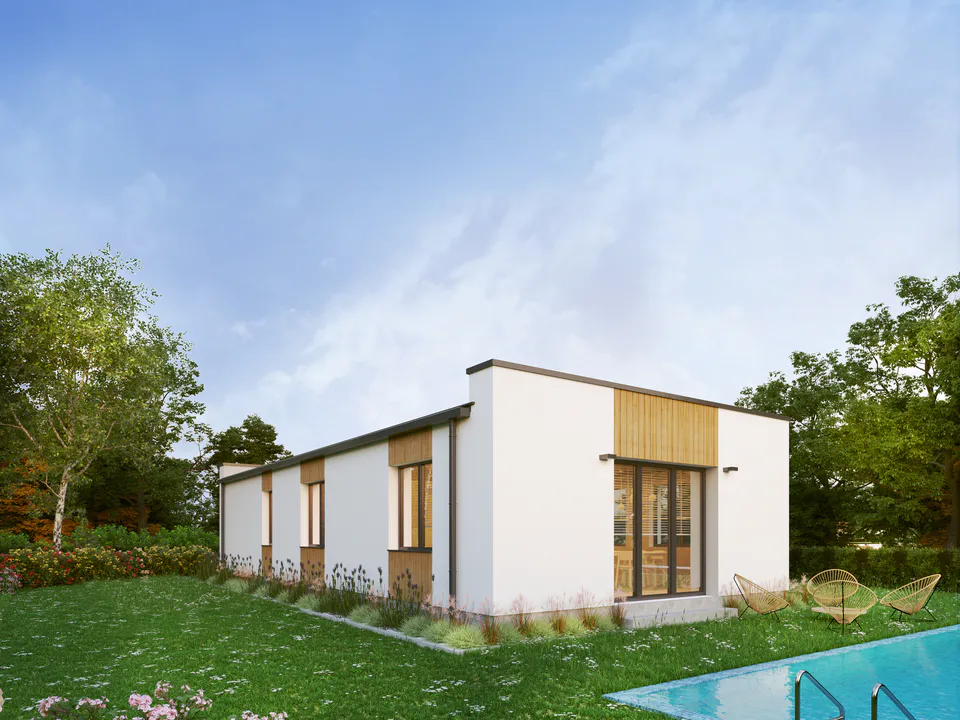 Проект одноэтажного дома с плоской крышей в современном стиле.