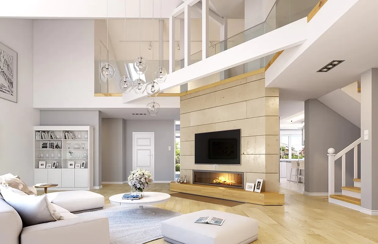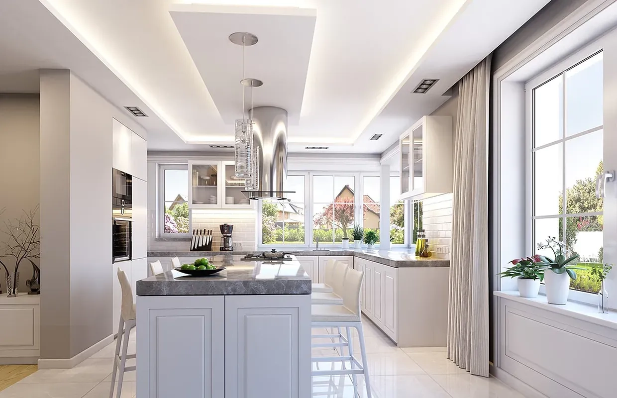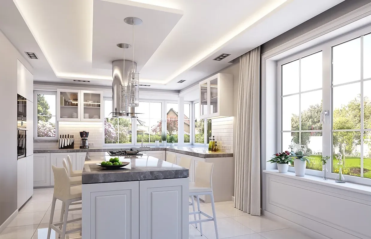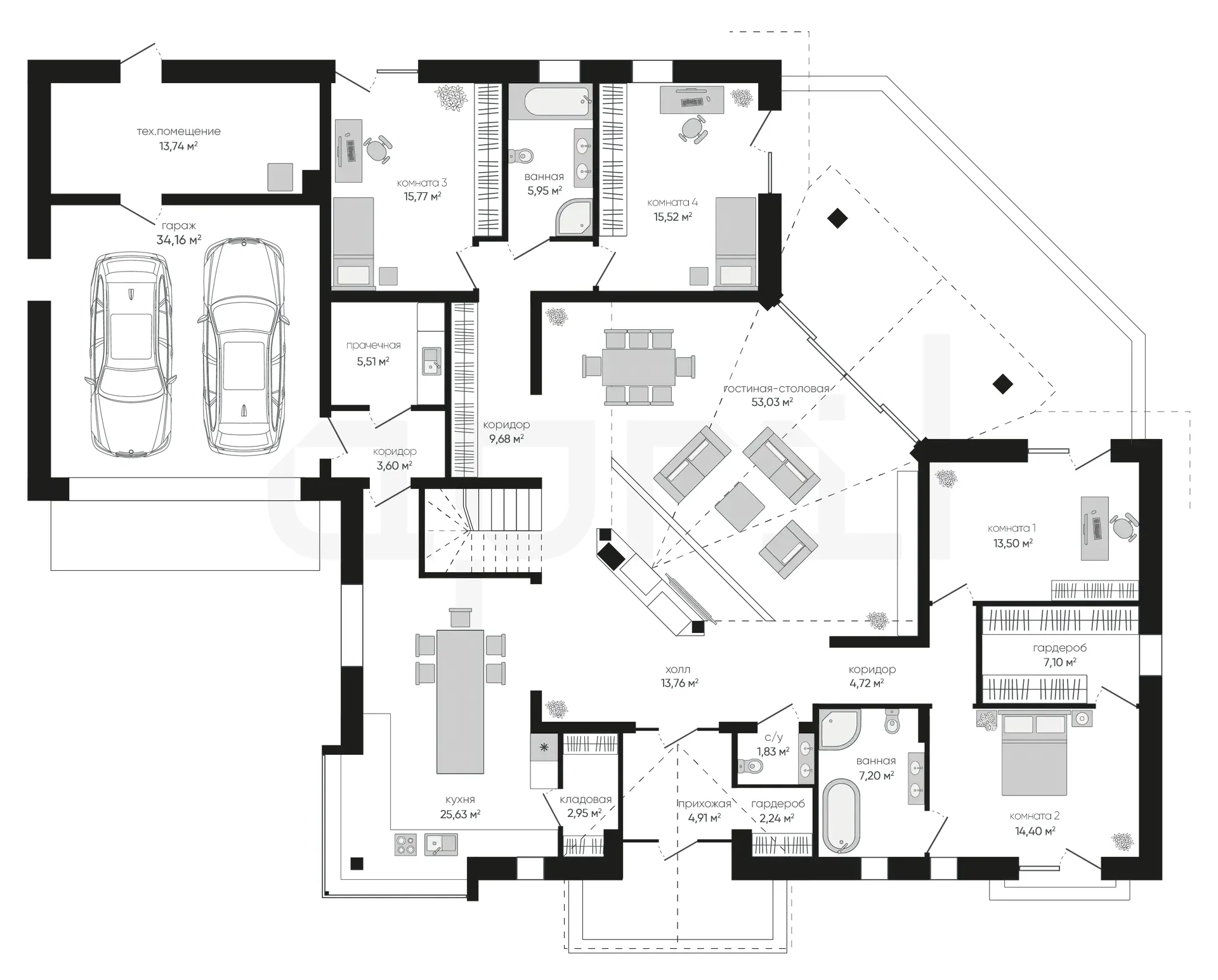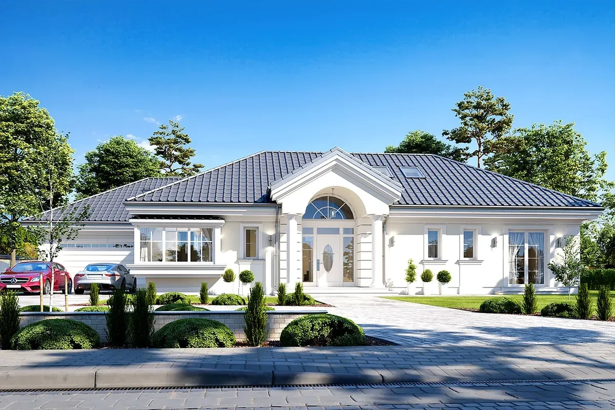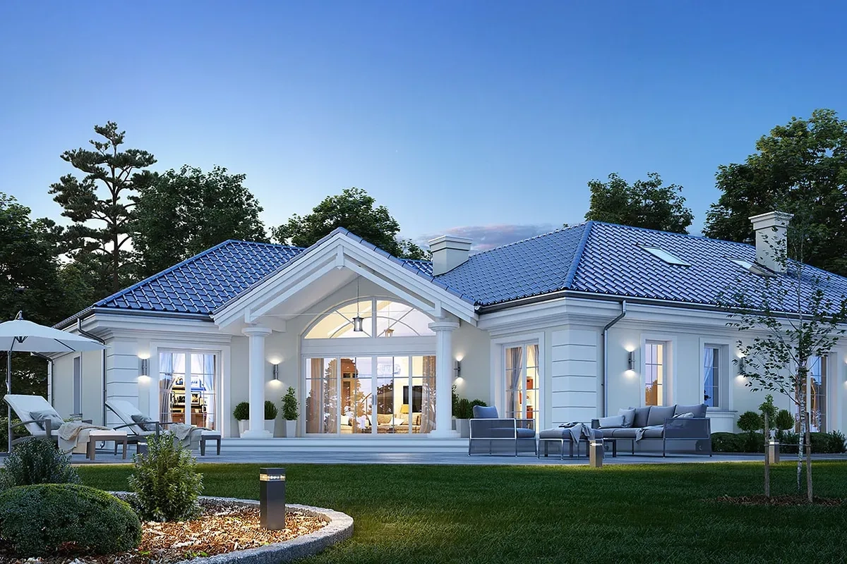 Проект выделяется наружным дизайном с большими площадями остекления и классическими наружными колоннами. Внутренний дворик со стороны сада создает уютное пространство в виде террасы с красивым навесом.