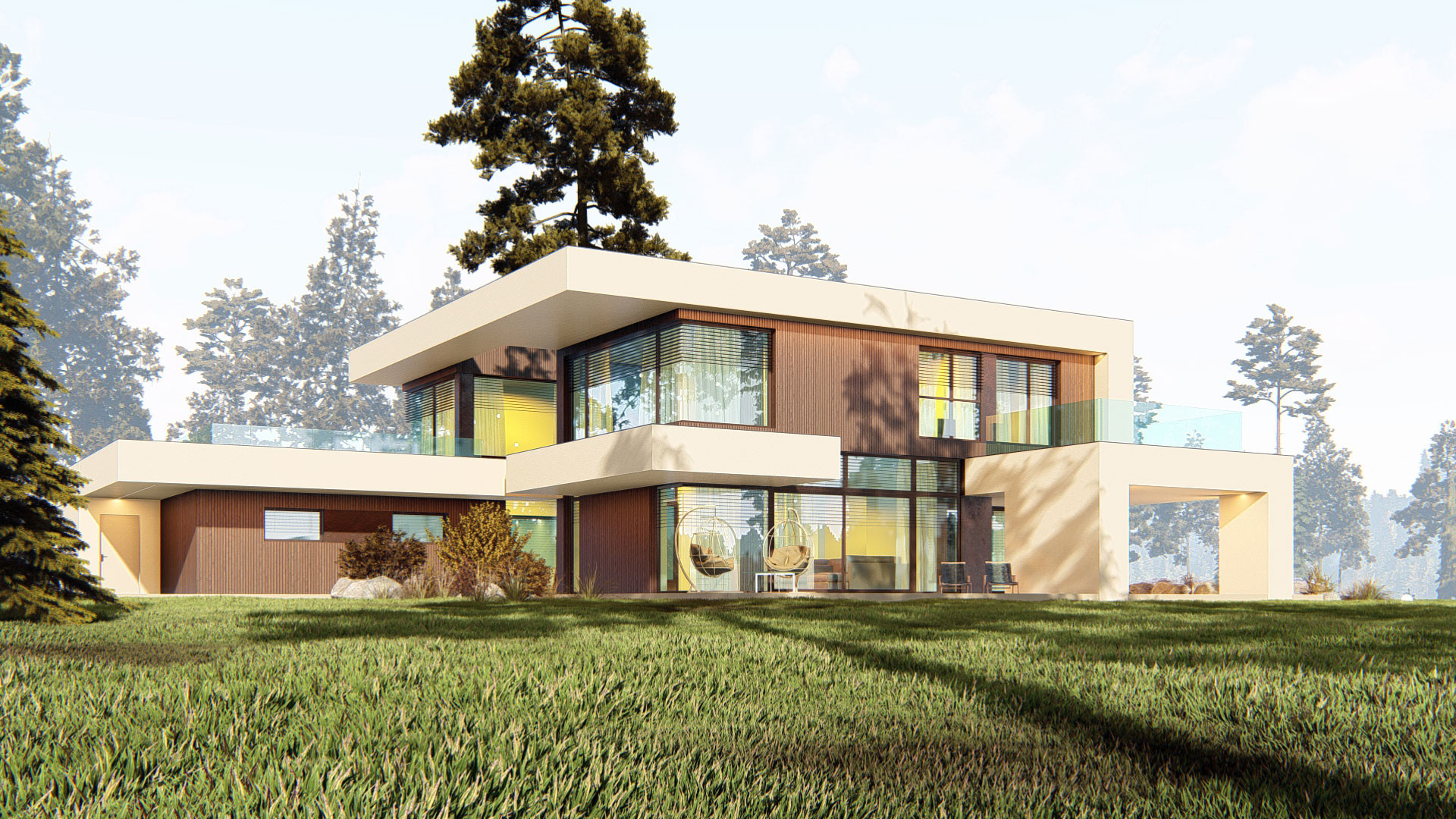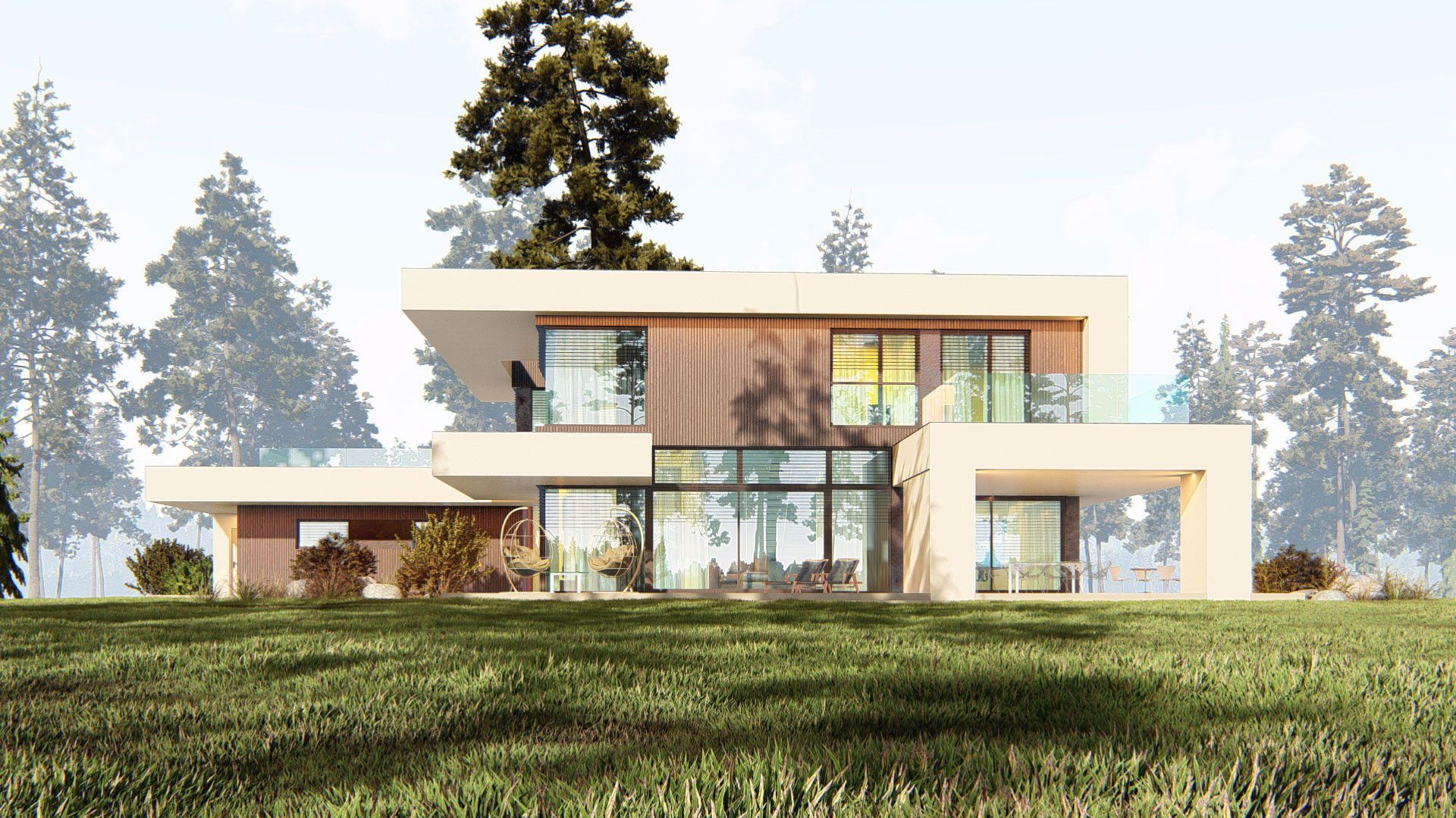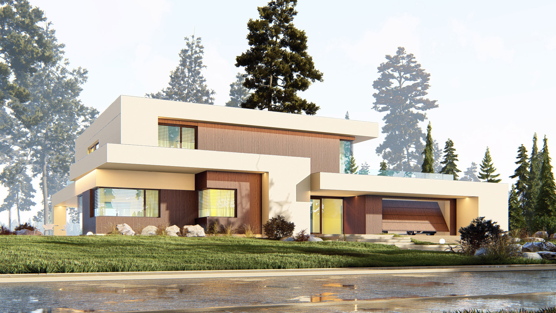 Строгость линий и плоская кровля уравновешиваются отделкой из натурального дерева и мягким акцентом светлой штукатурки, что придает дому современный, но в то же время уютный облик.