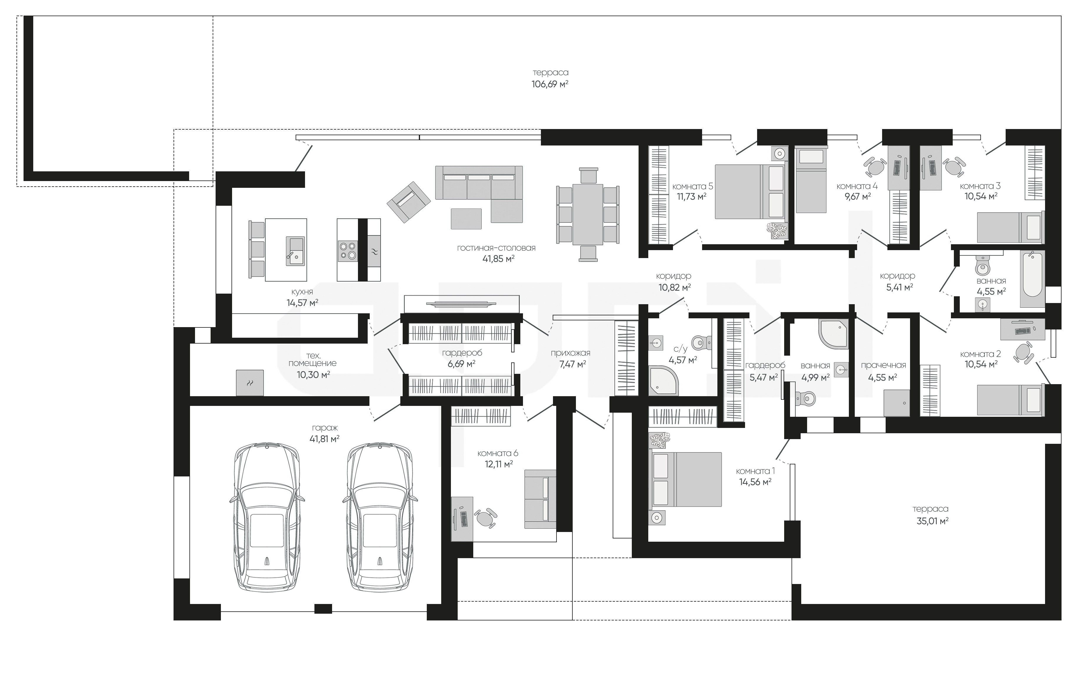 Террасы в этом проекте — не просто пристройки, а логическое продолжение геометрии блоков. Основная садовая терраса опоясывает заднюю часть здания, в то время как боковая, расположенная спереди, носит более приватный характер и скрыта от посторонних глаз.