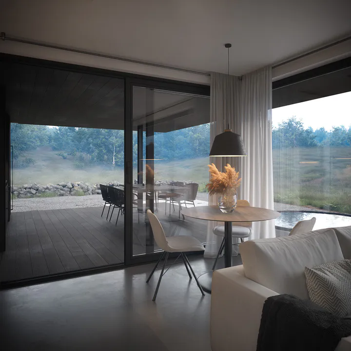 Панорамное остекление стирает границы между интерьером и террасой, наполняя дом светом.