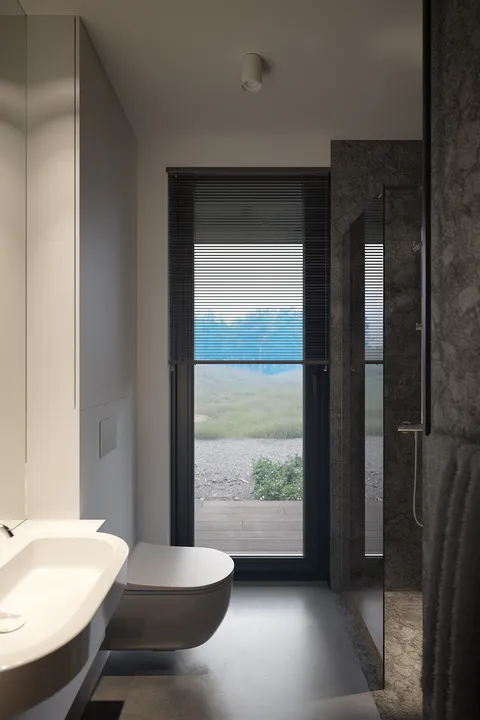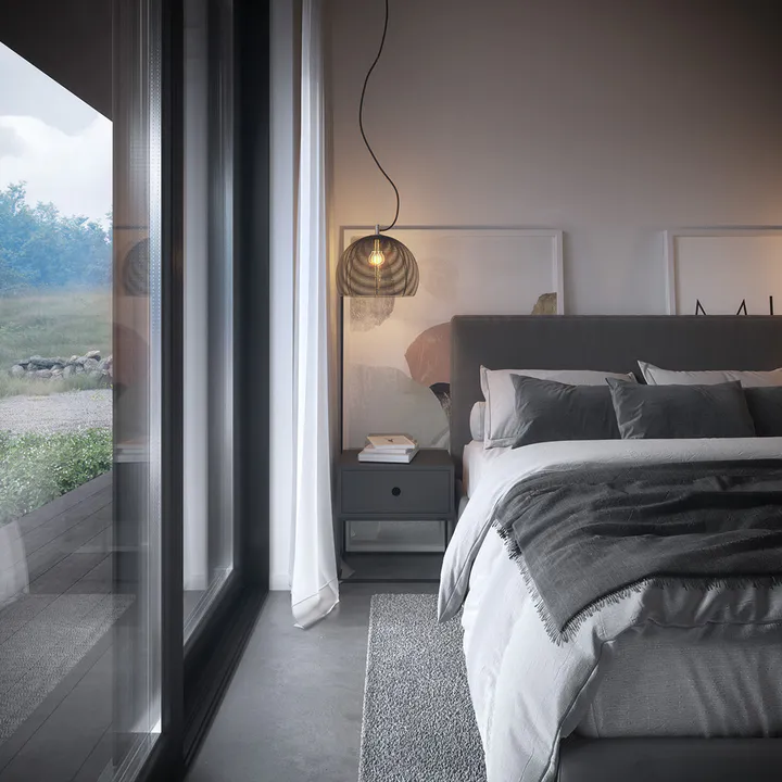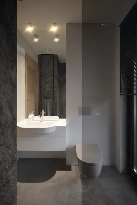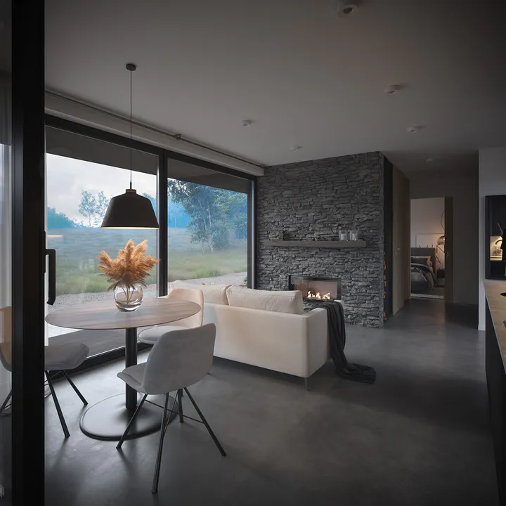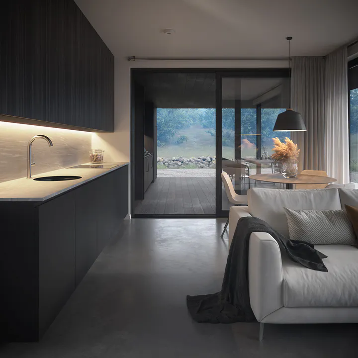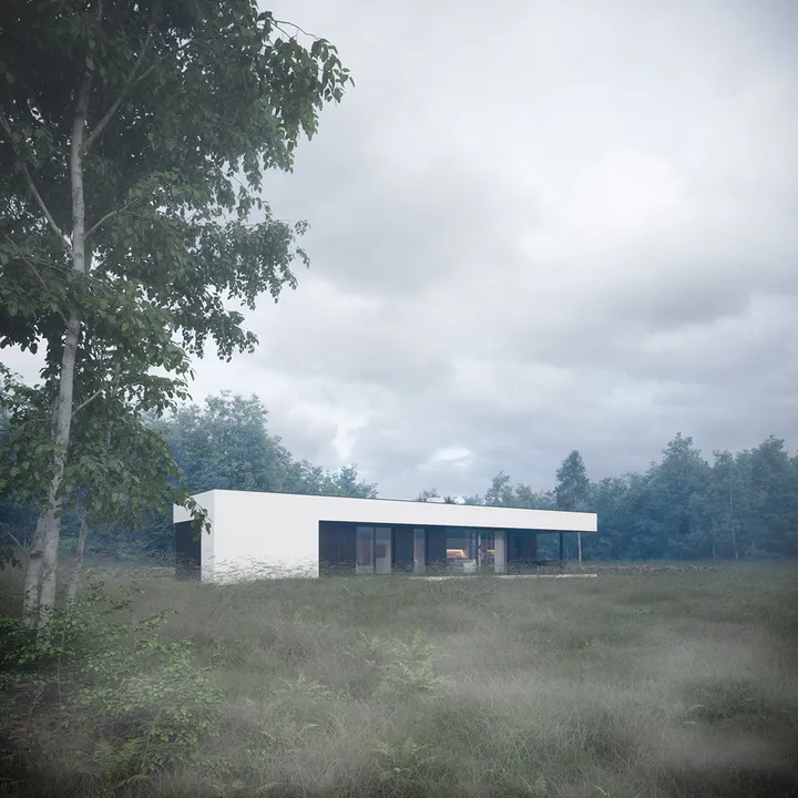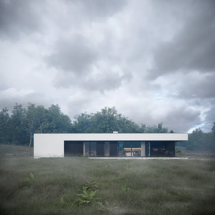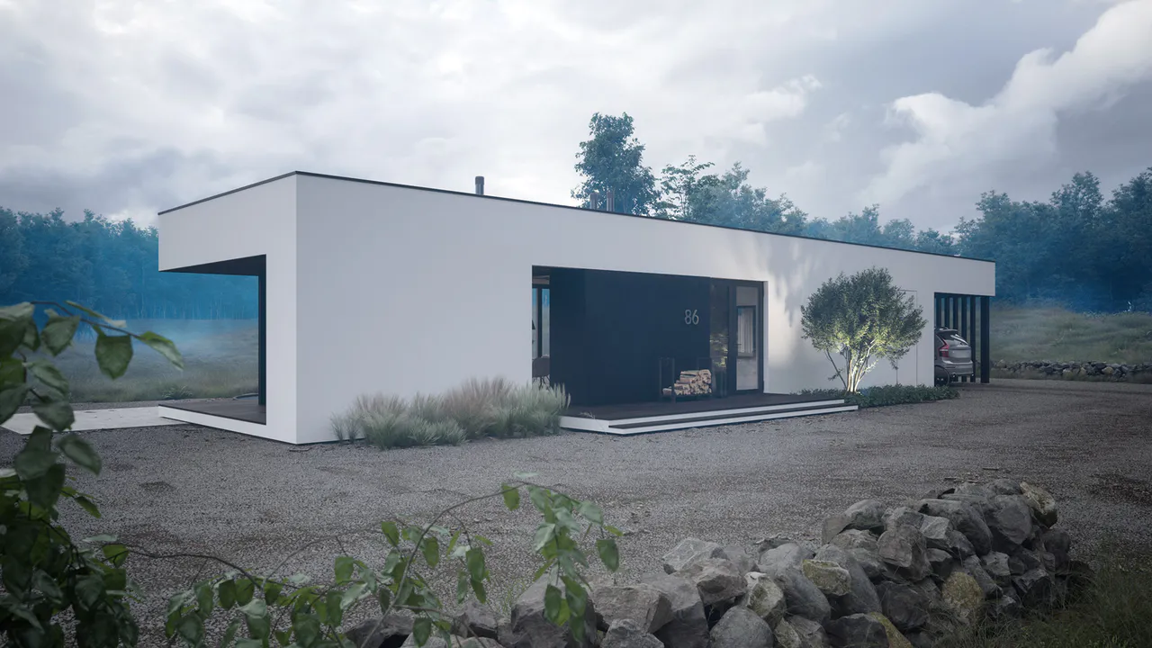 Здание в стиле Хайтек выполнено в духе минимализма и дополнено плоской кровлей. Экстерьер базируется на контрасте фактур: белоснежной штукатурки и акцентного планкена из темного дерева.