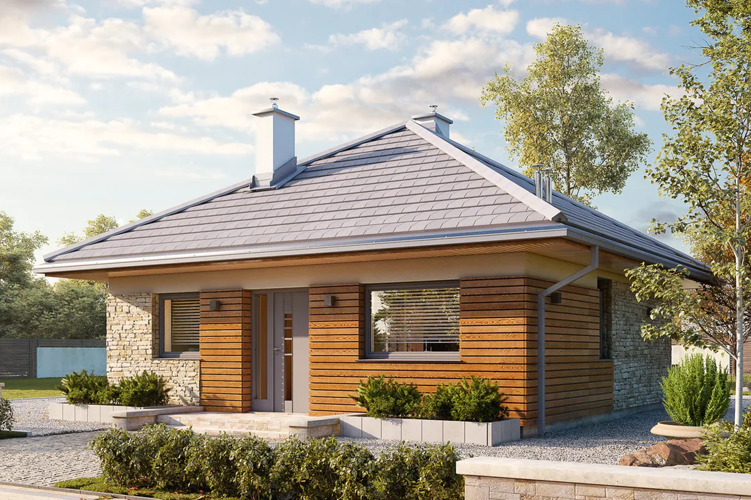 Проект небольшого одноэтажного дома с навесом и террасой.