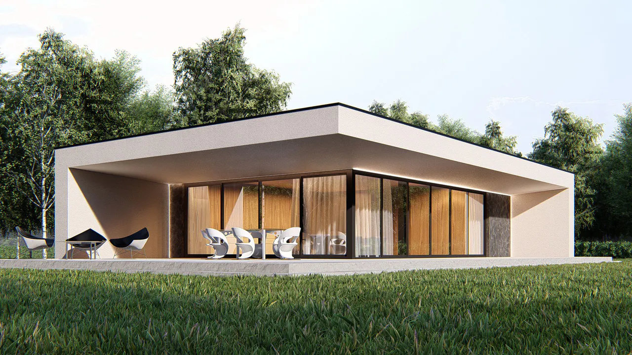 Проект небольшого одноэтажного дома с плоской крышей и террасой.