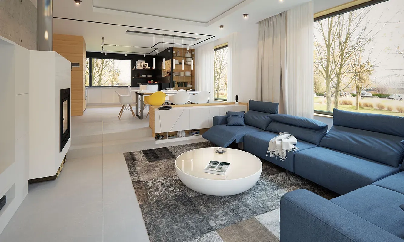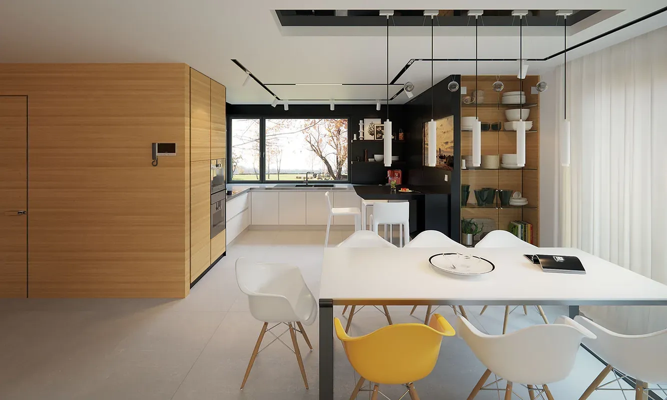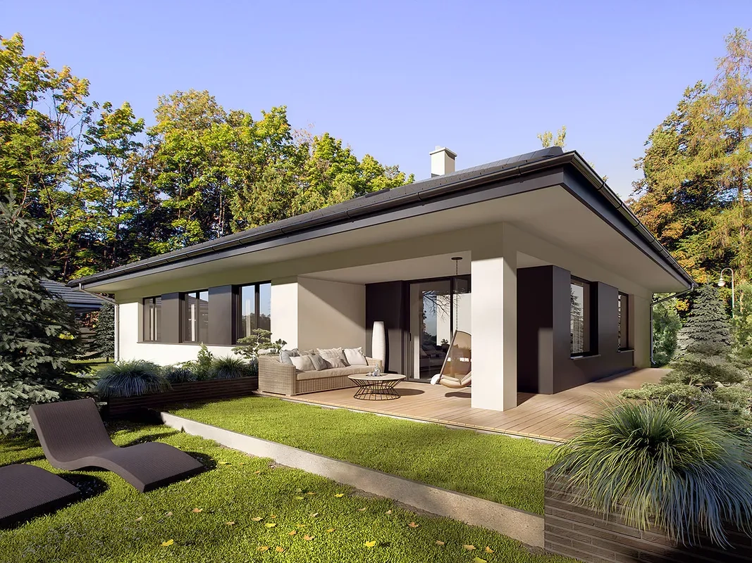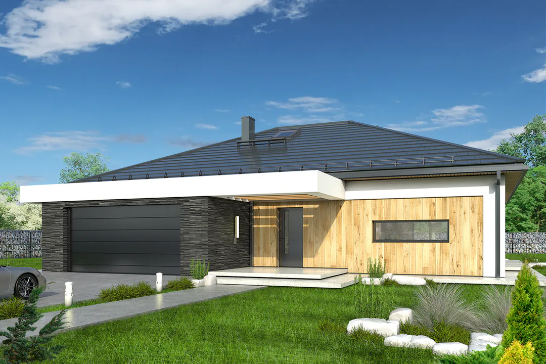 Проект одноэтажного дома с четырехскатной крышей. Фасады окрашены в светлые тона с черными элементами, такими как крыша, гаражные ворота и входная группа. Стиль дома подчеркивается использованием простых форм и линий, а также современными материалами.