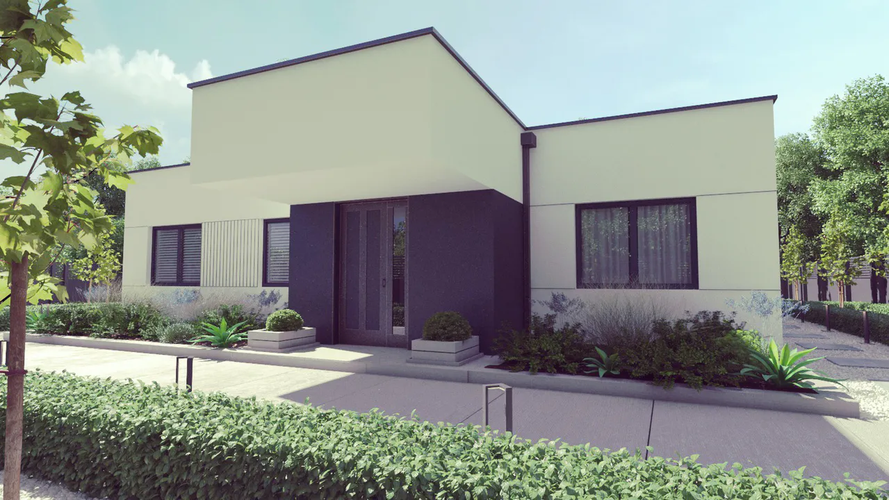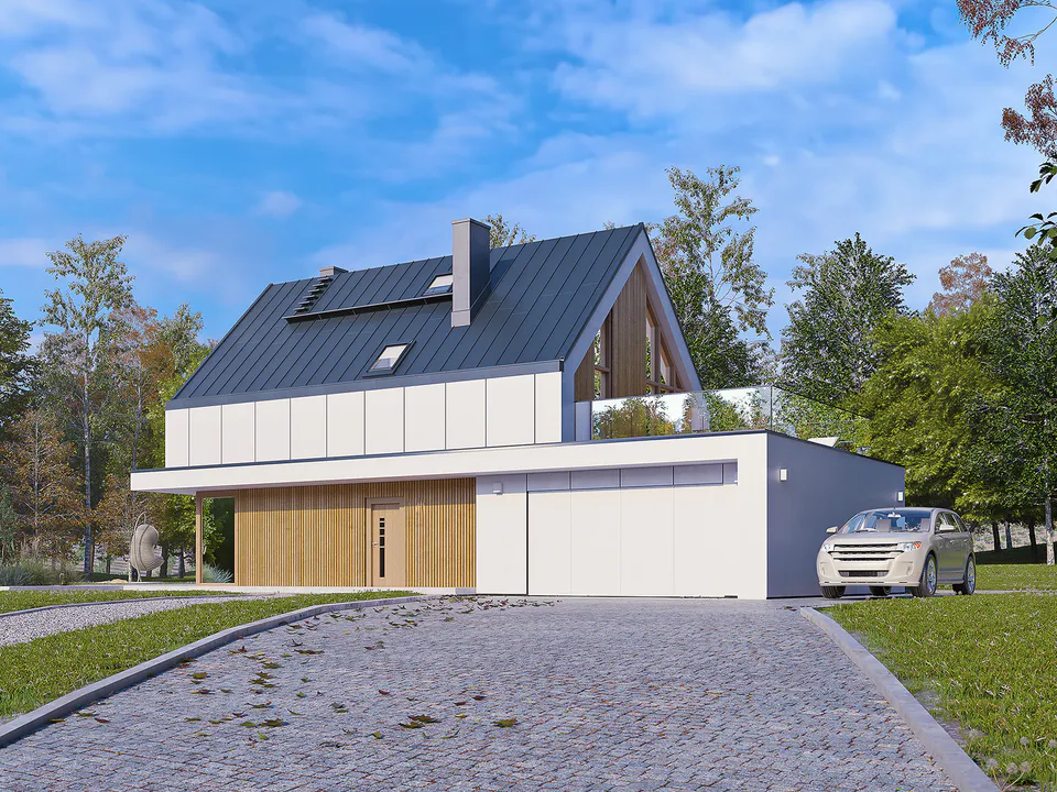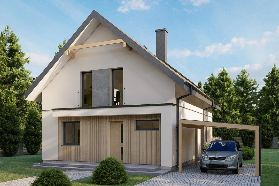 Фасад дома сочетает в себе белые штукатурные стены и декоративные элементы из дерева, что придает ему современный и эстетический вид. Центральная часть фасада выделена облицовкой под дерево и украшена вертикальными деревянными планками.