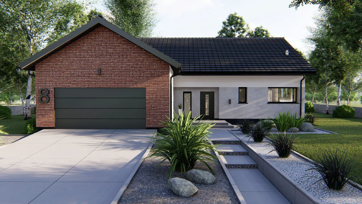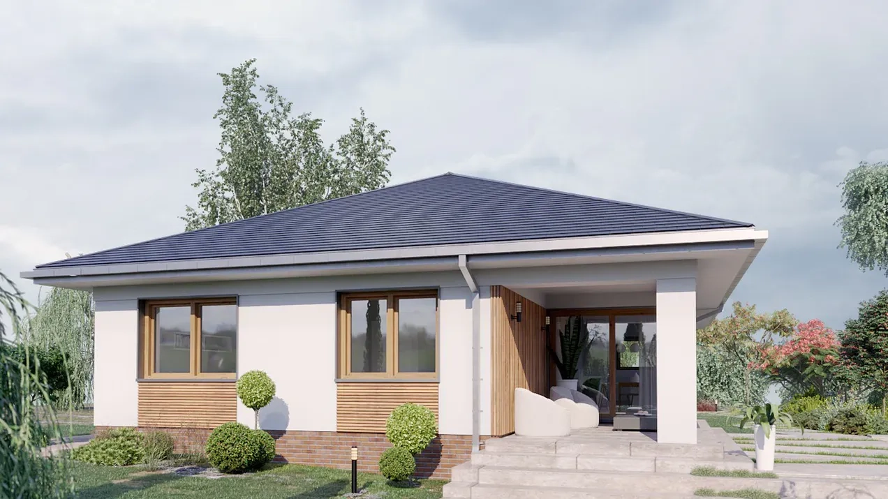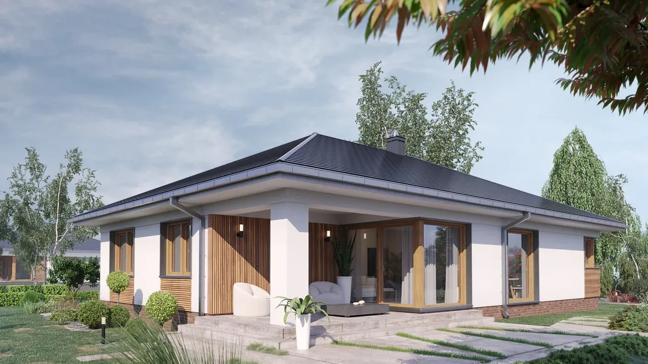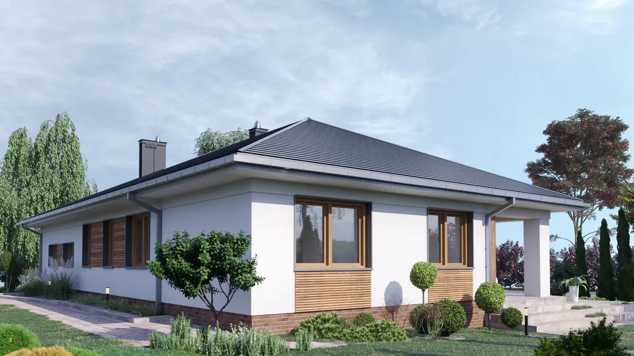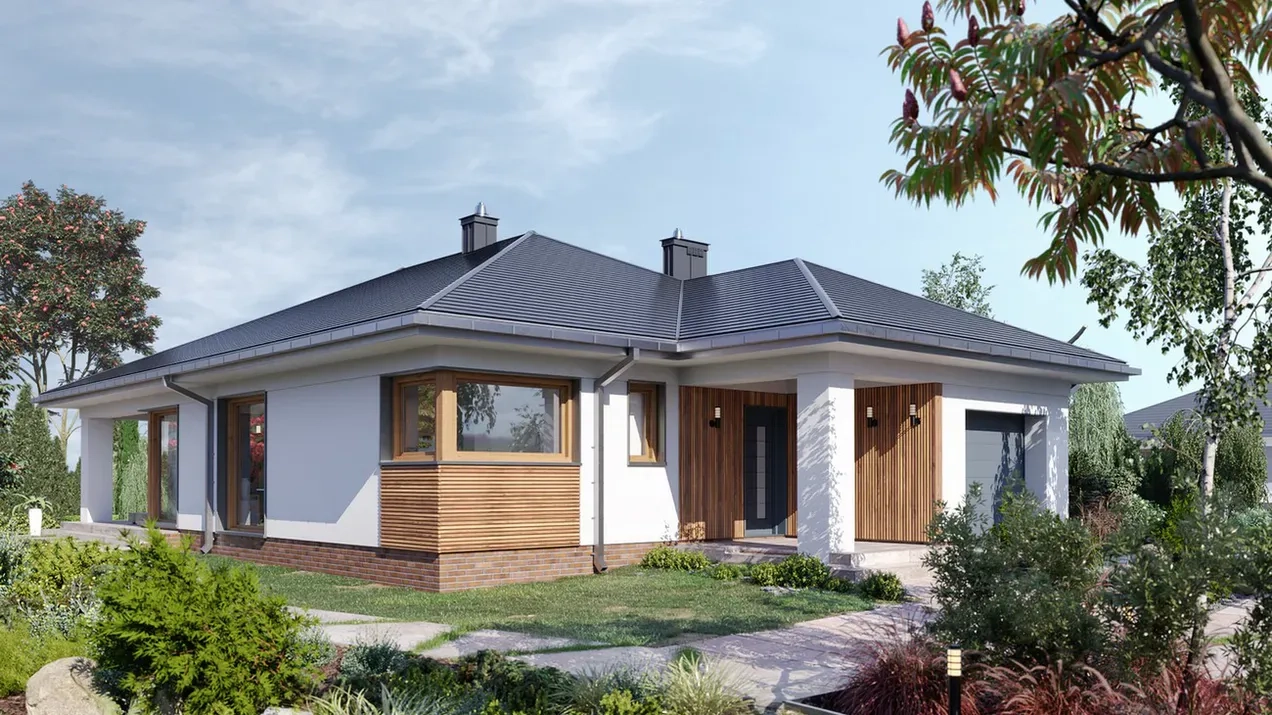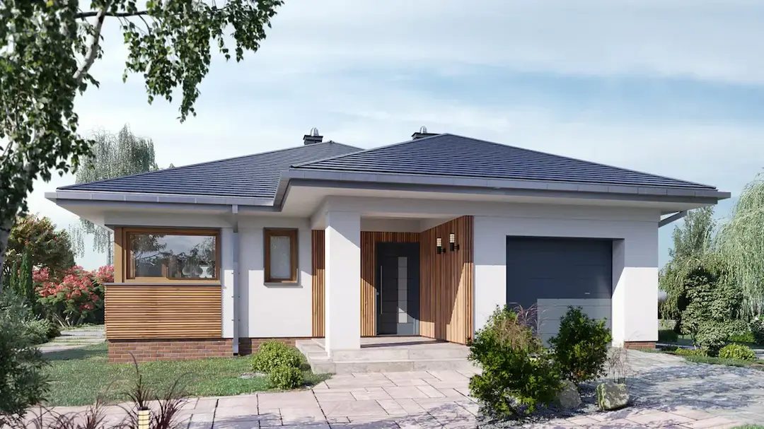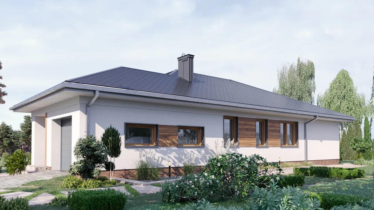 Проект одноэтажного дома с гаражом и террасой удовлетворит потребности 2-4 человек. Использование деревянных элементов придает дому теплоту и гармонию с окружающей природой, а грамотно спланированное пространство поможет создать уютную и комфортную обстановку, а также обеспечит эффективное использование каждого квадратного метра.