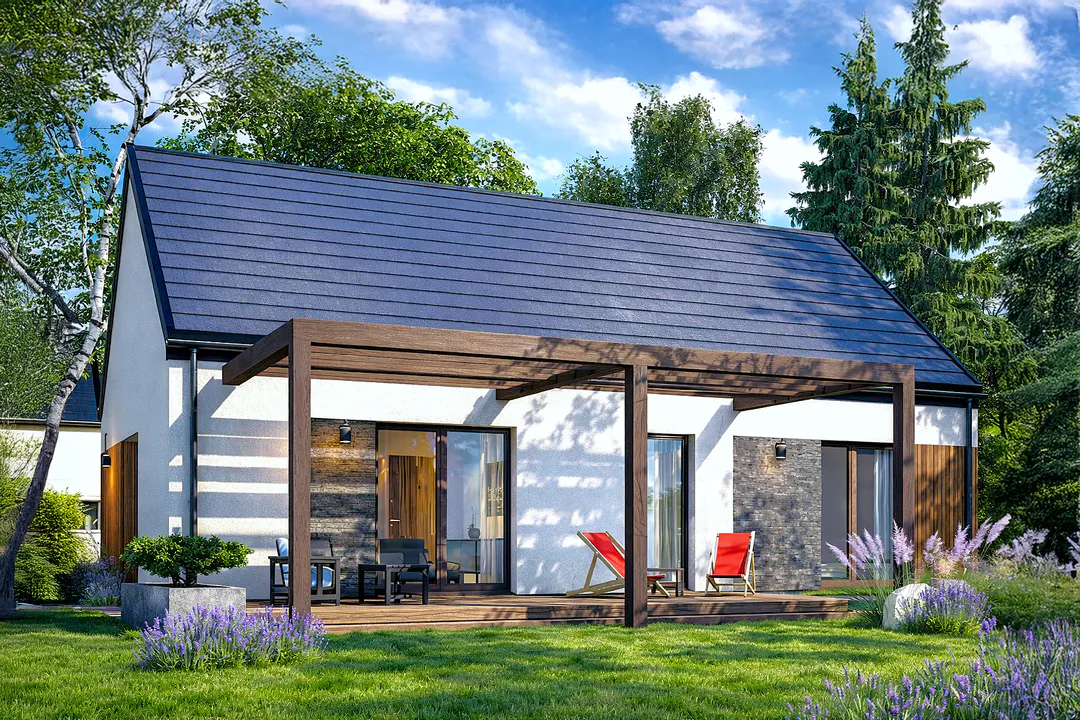 Проект компактного одноэтажного дома с двускатной крышей и террасой.