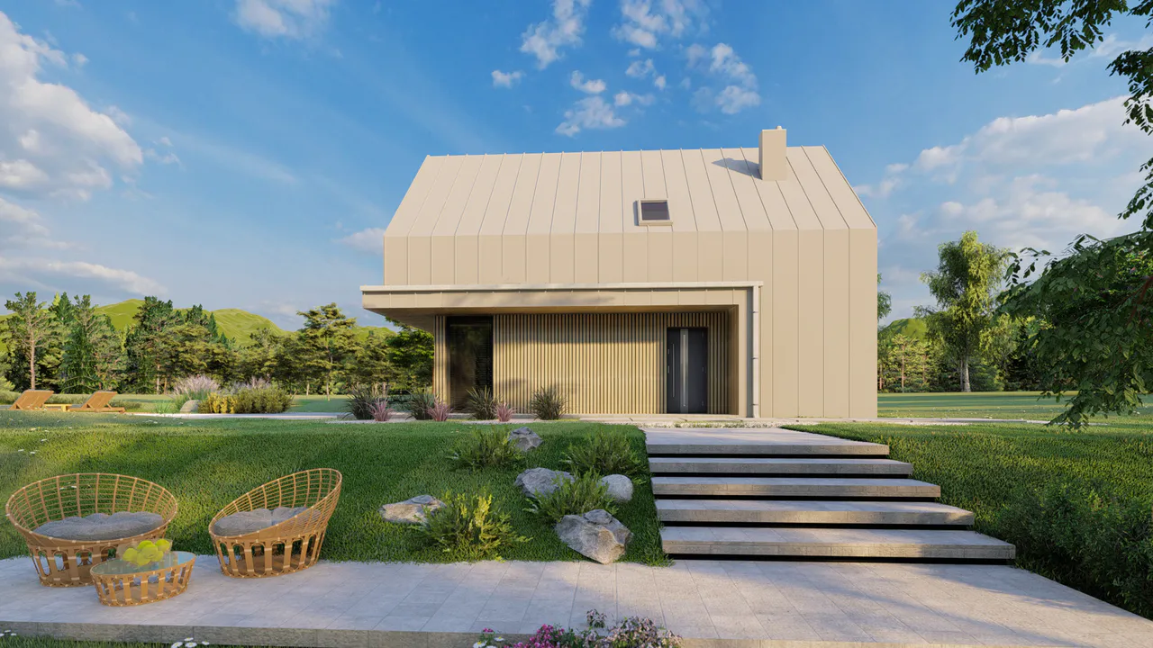 Вместо контраста цветов здесь работает контраст фактур. Гладкий металл кровли меняет облик в зависимости от освещения, а вертикальные деревянные рейки создают ритмичную игру теней, что придает фасаду глубину.