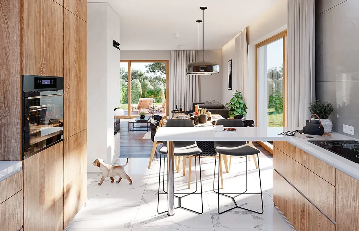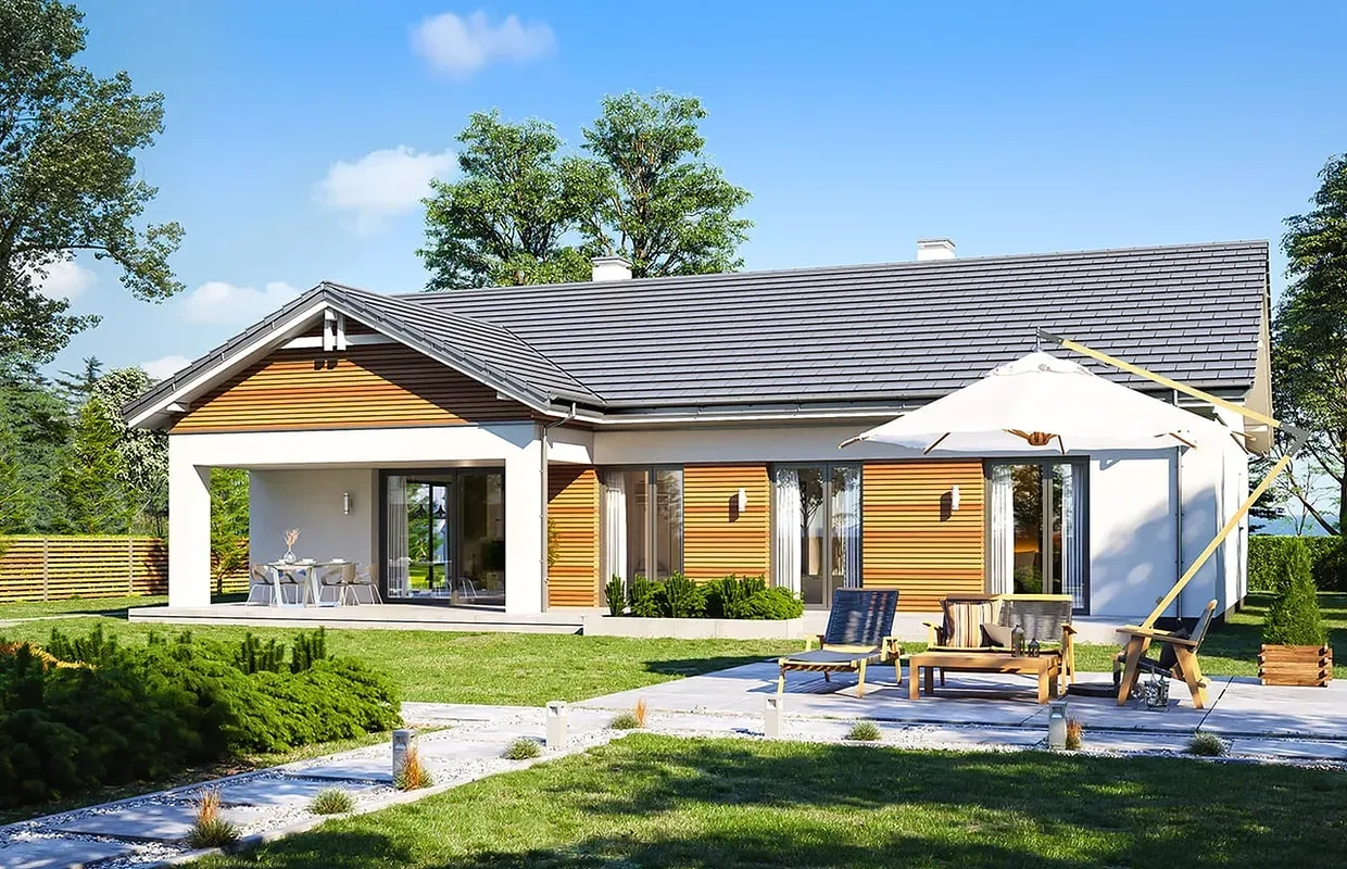 Интересные детали и декоративные элементы делают этот проект дома уникальным и привлекательным. А большая площадь остекления помогает максимально использовать естественное освещение и обеспечивает прекрасный вид на окружающий ландшафт.