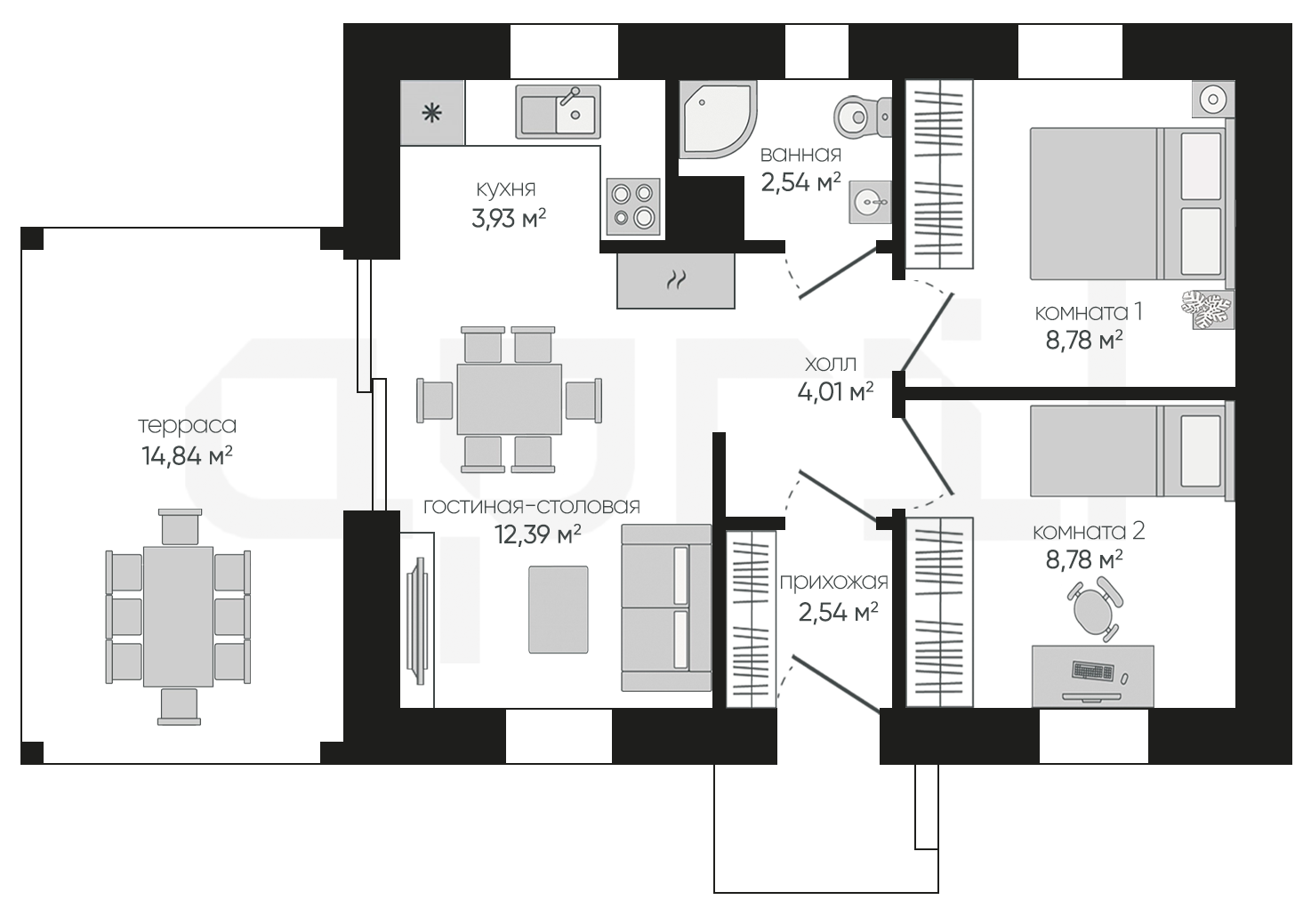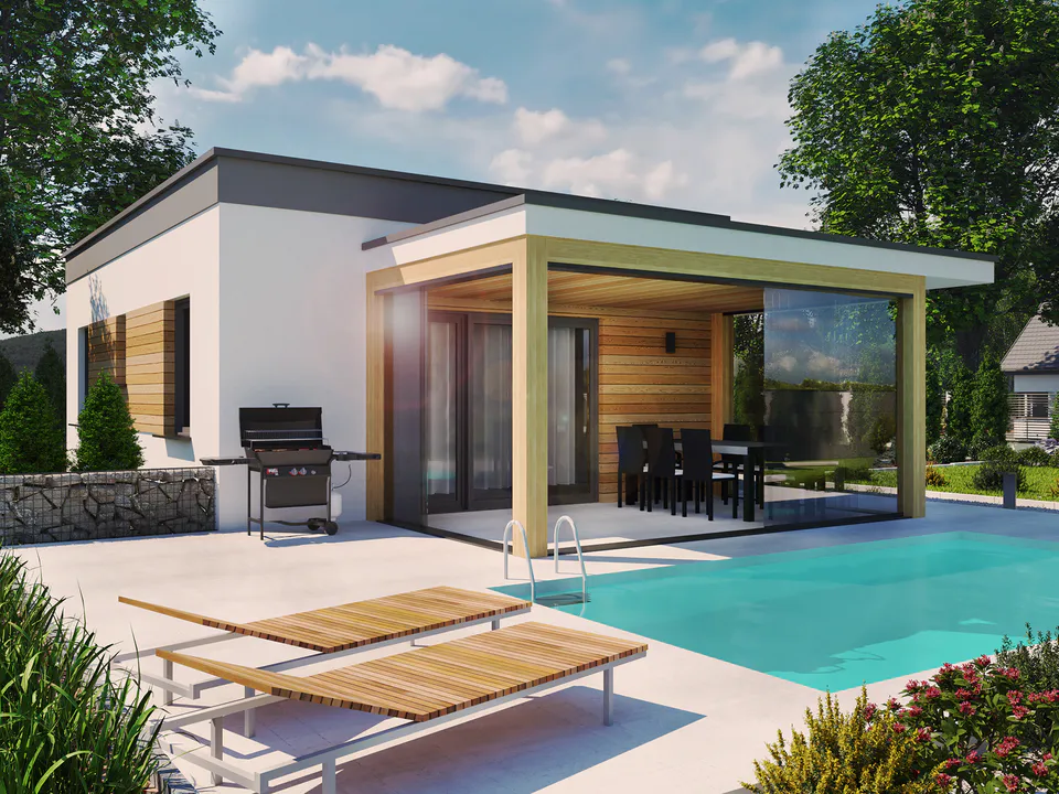 Проект компактного одноэтажного дома с плоской крышей и террасой.