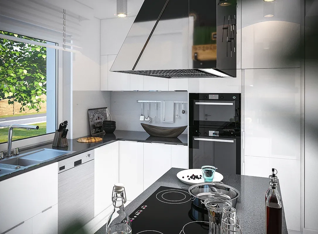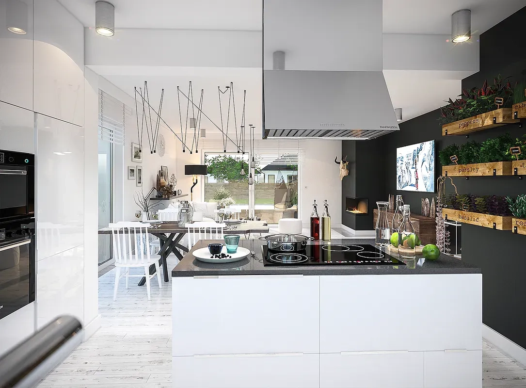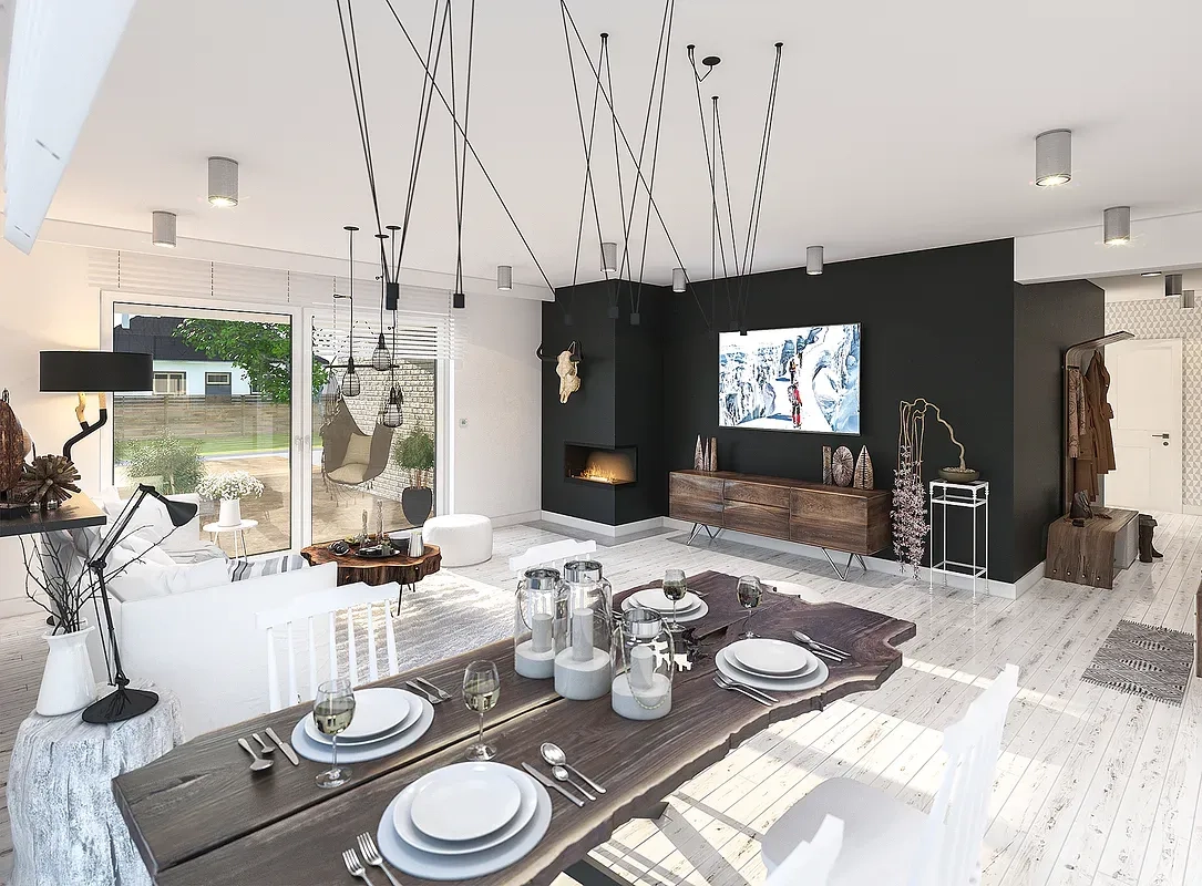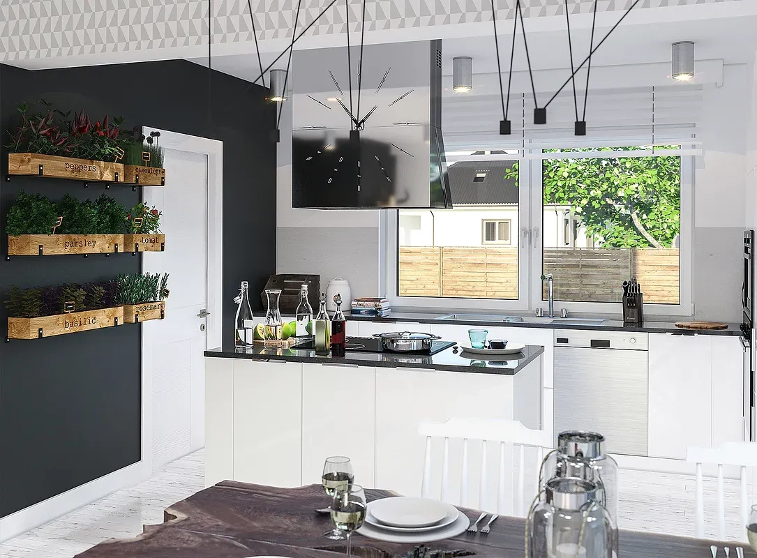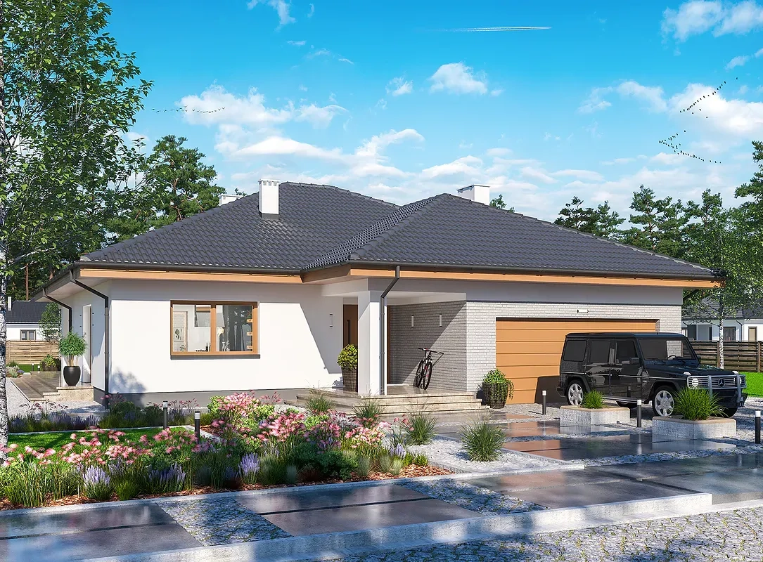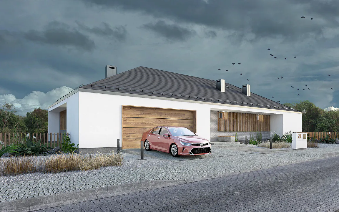 Проект дома, отличающийся простой и элегантной формой, покрытый многоскатной темной крышей с выступающим гаражом.