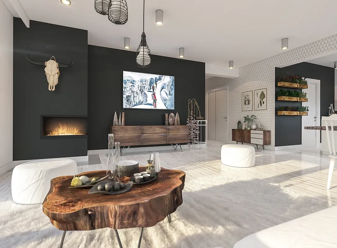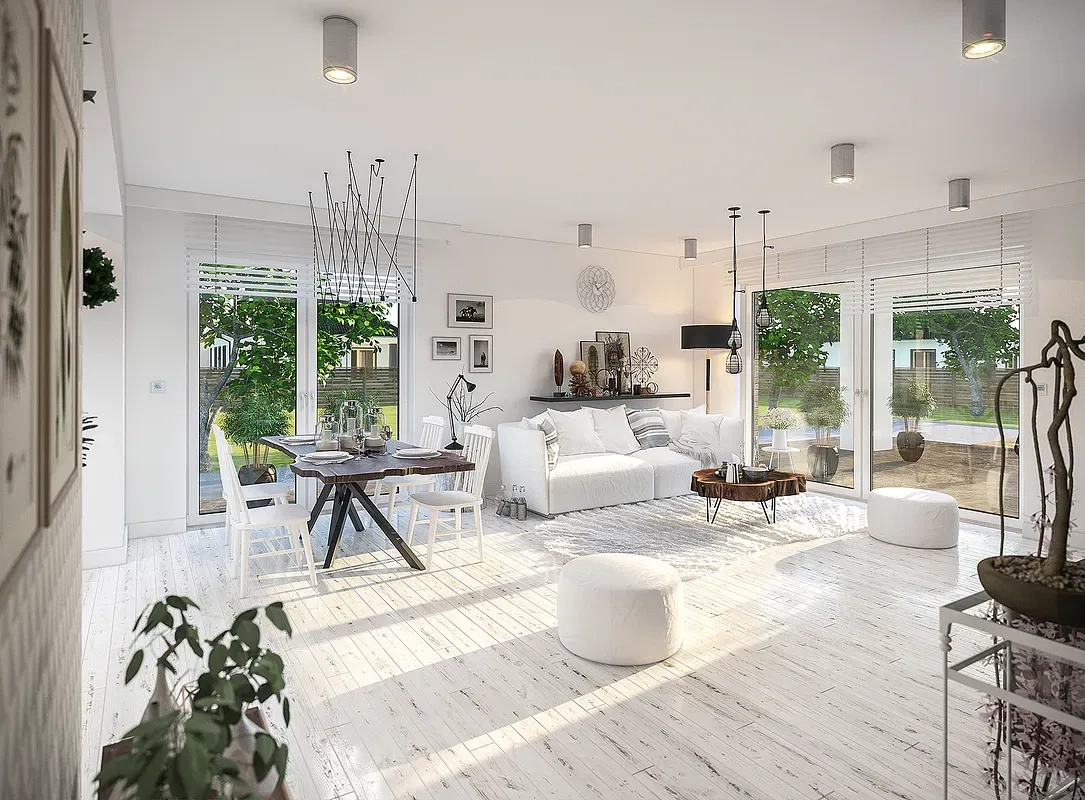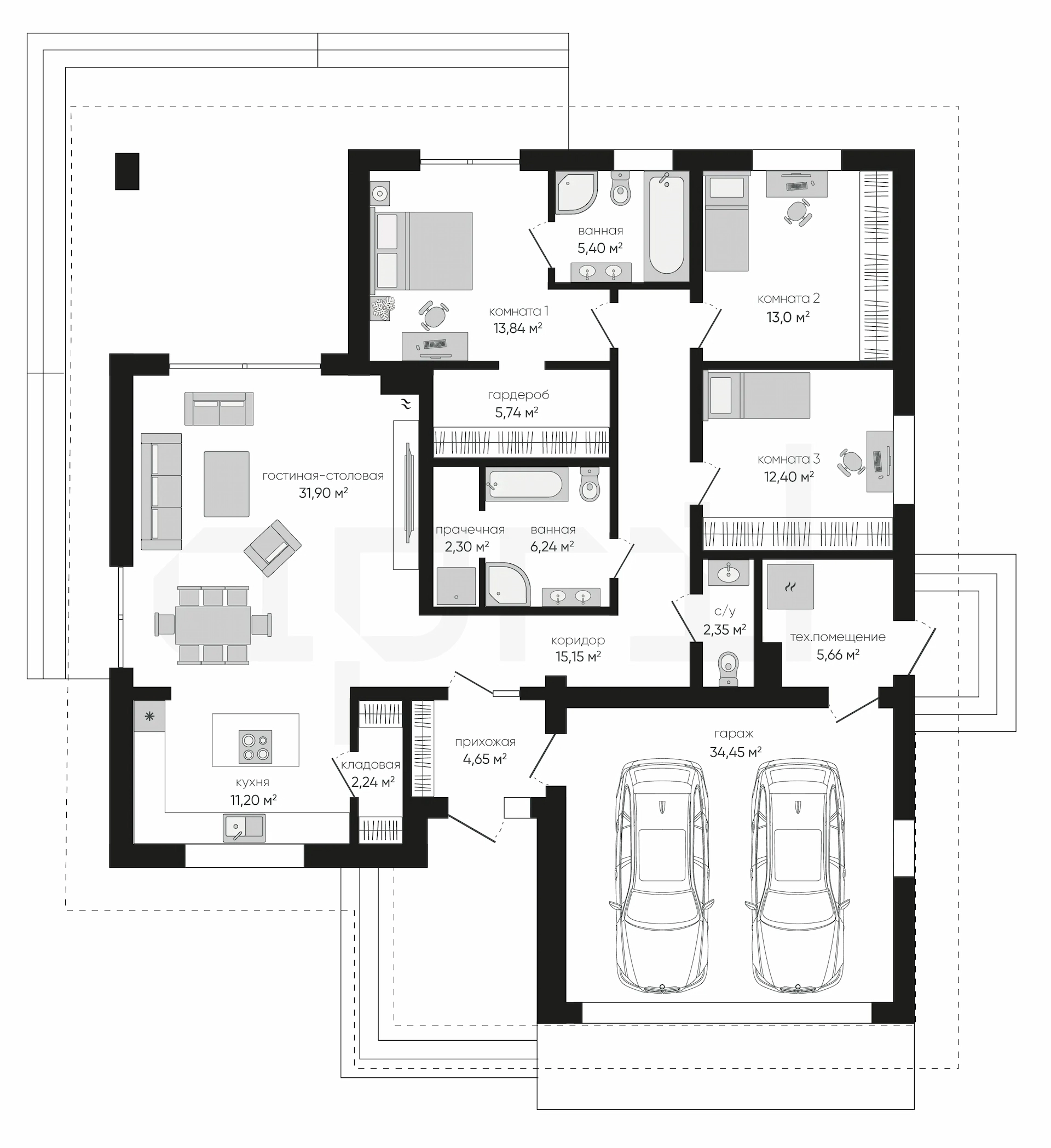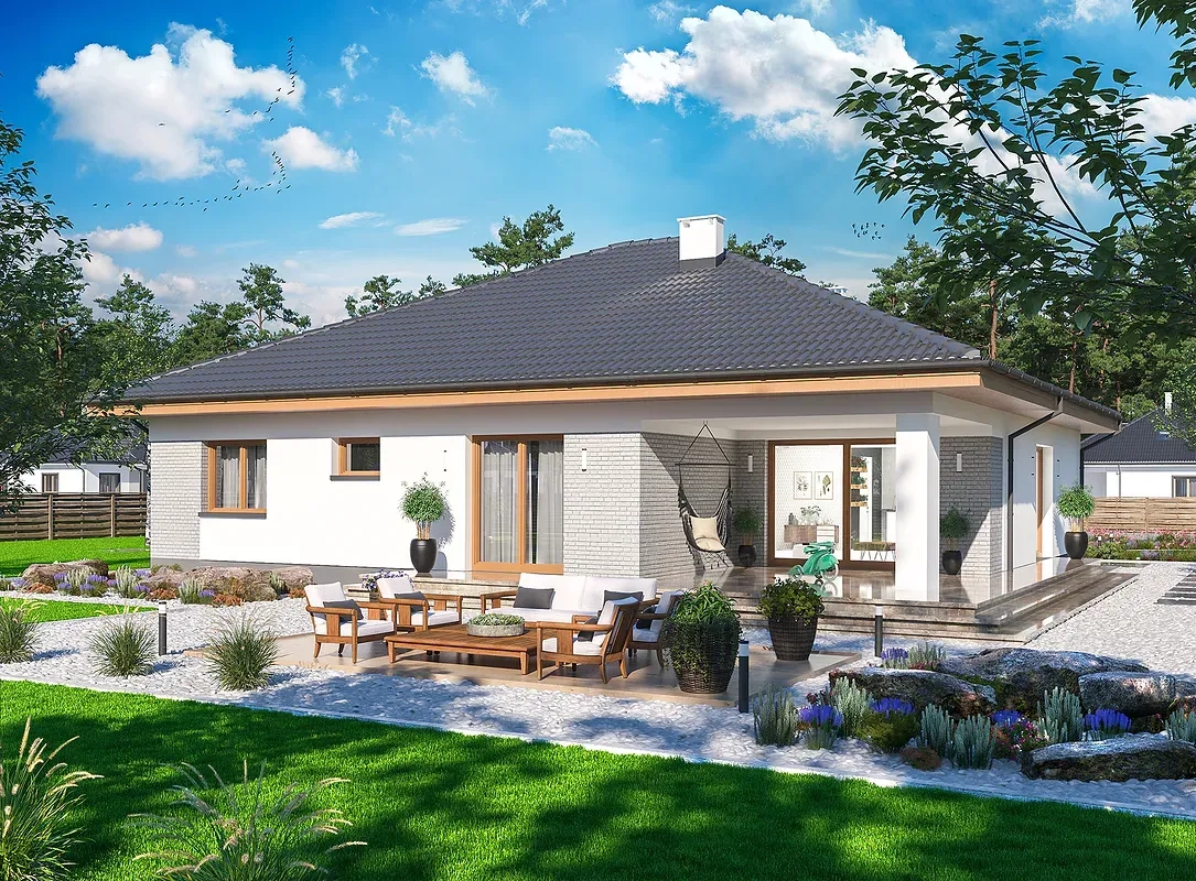 Проект дома с комбинированным фасадом: большая часть отделана штукатуркой белого цвета, а другую украшает кирпич светлого оттенка. Крыша темного цвета покрывает входную группу и террасу. Окна дома разного размера добавляют интерес и динамику к фасаду, придавая ему современный и оригинальный вид.