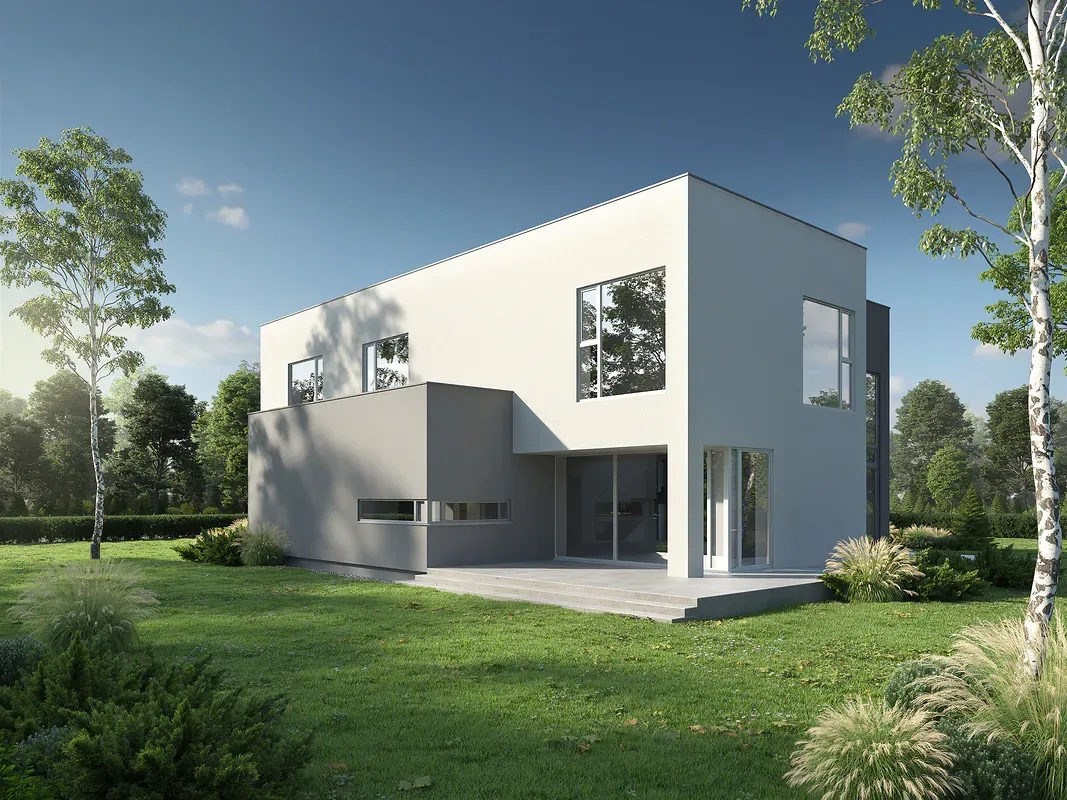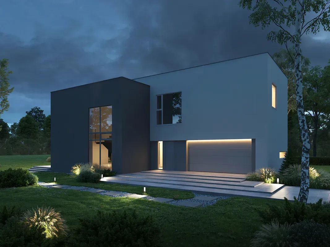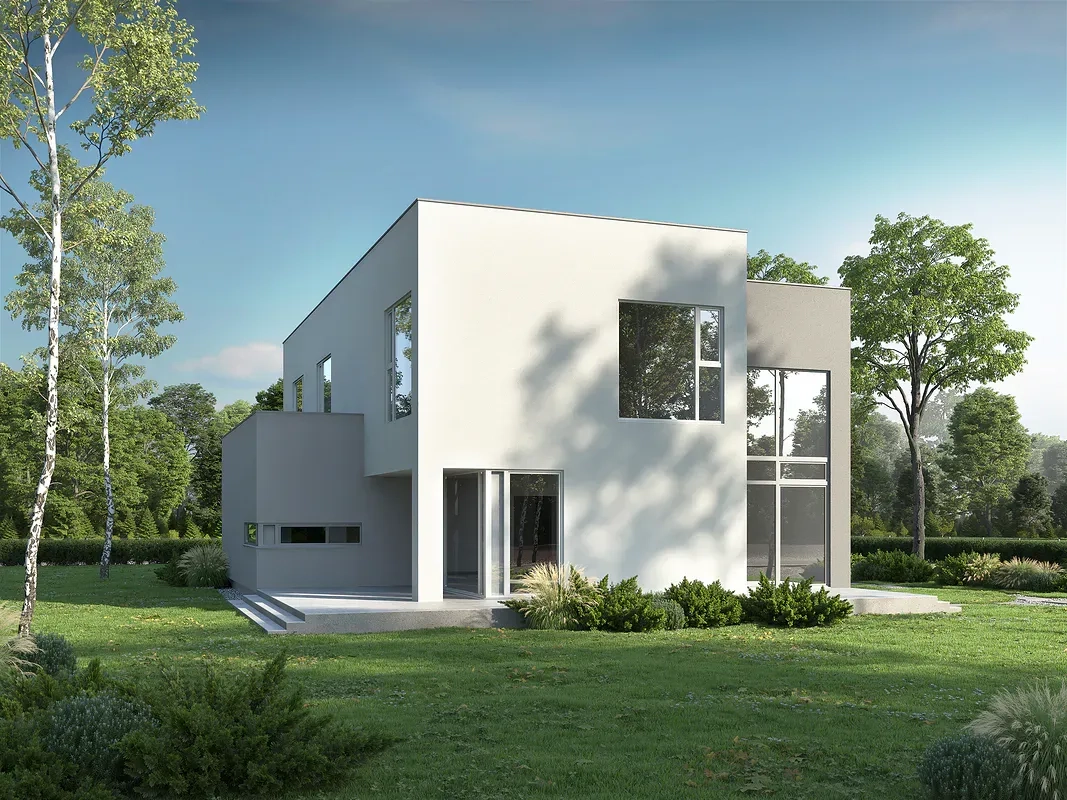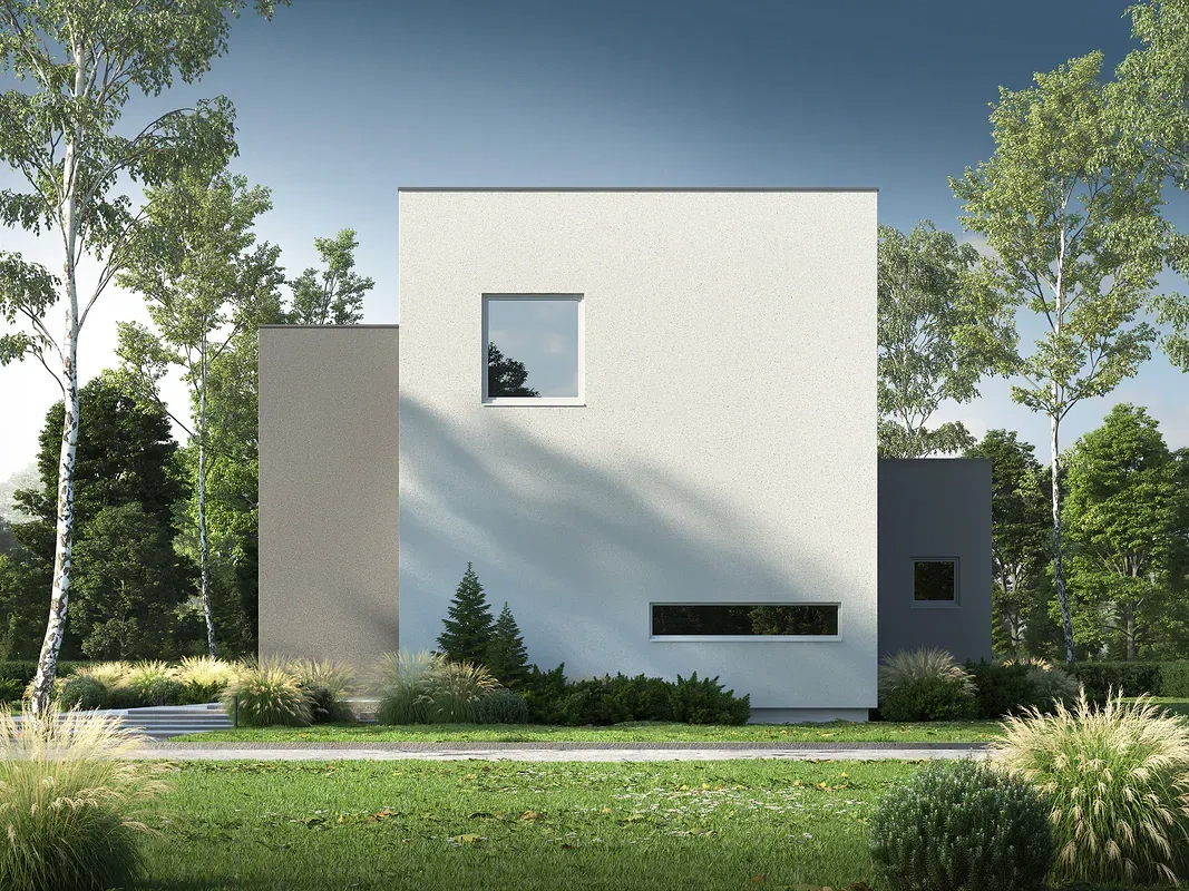 Проект современного дома с минималистичным дизайном в стиле хайтек. Дом двухэтажный с плоской крышей и большими панорамными окнами. Фасад окрашен в спокойные серые и белые тона.