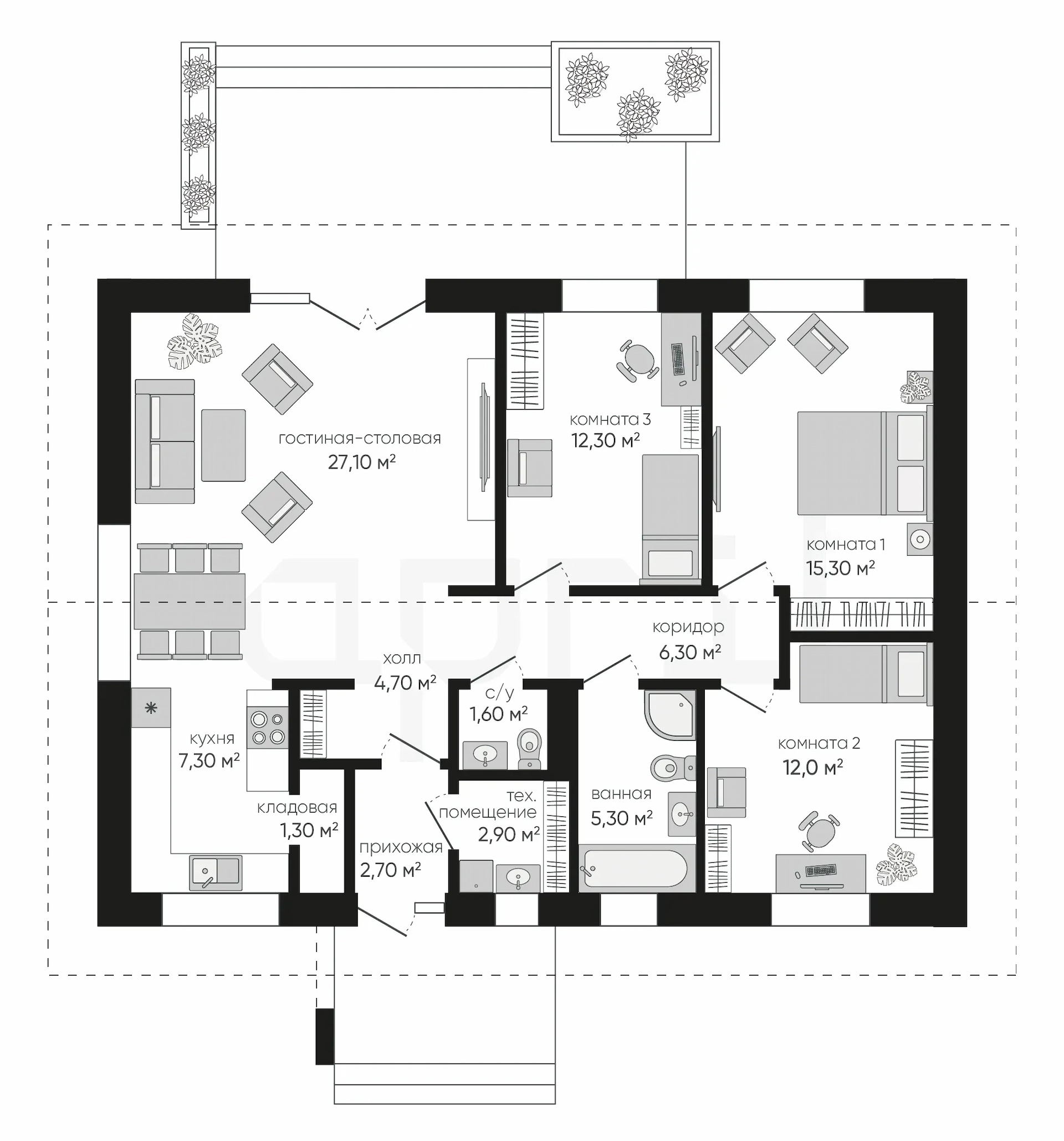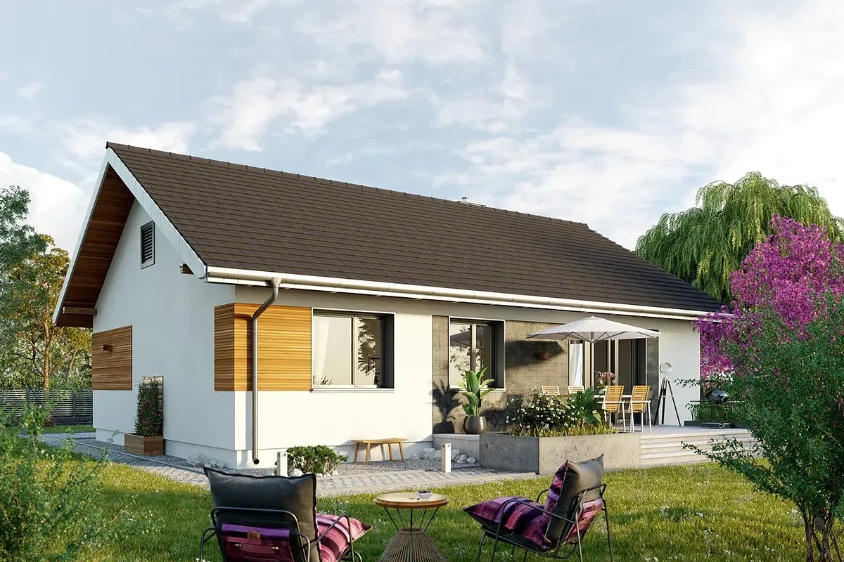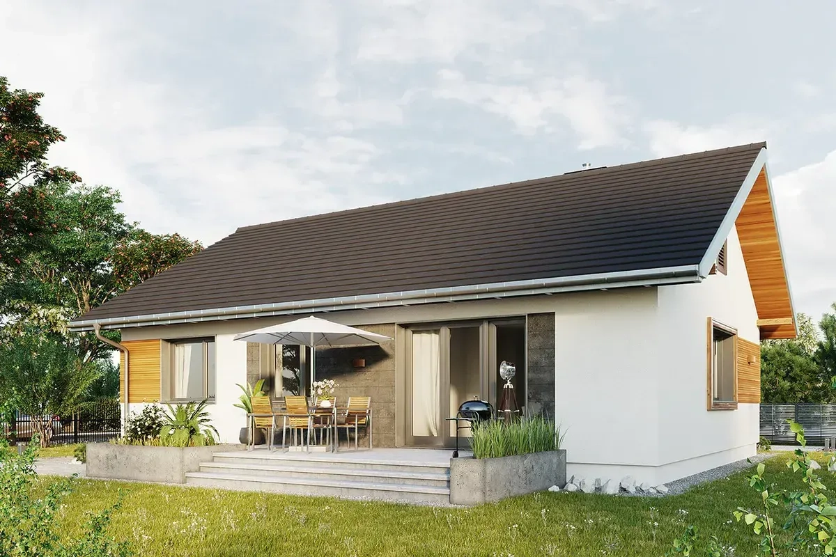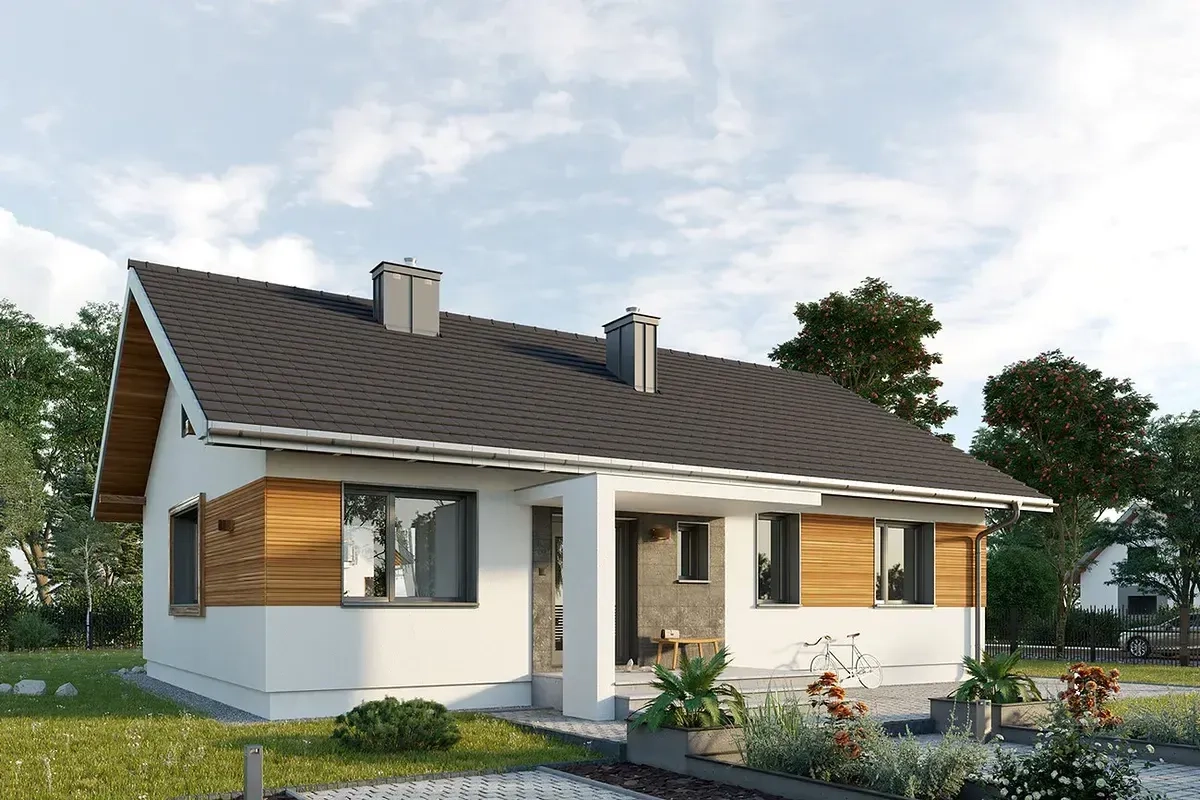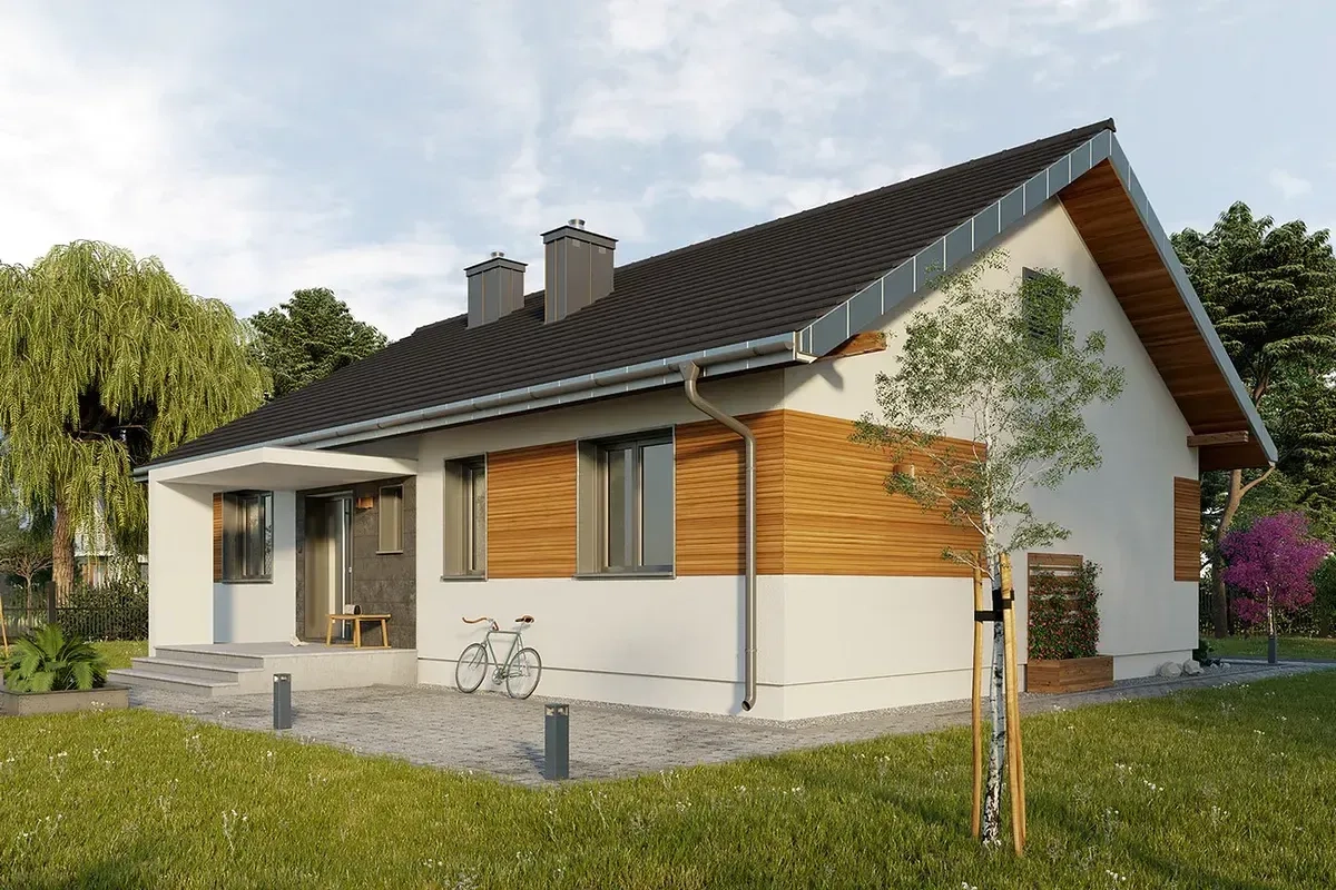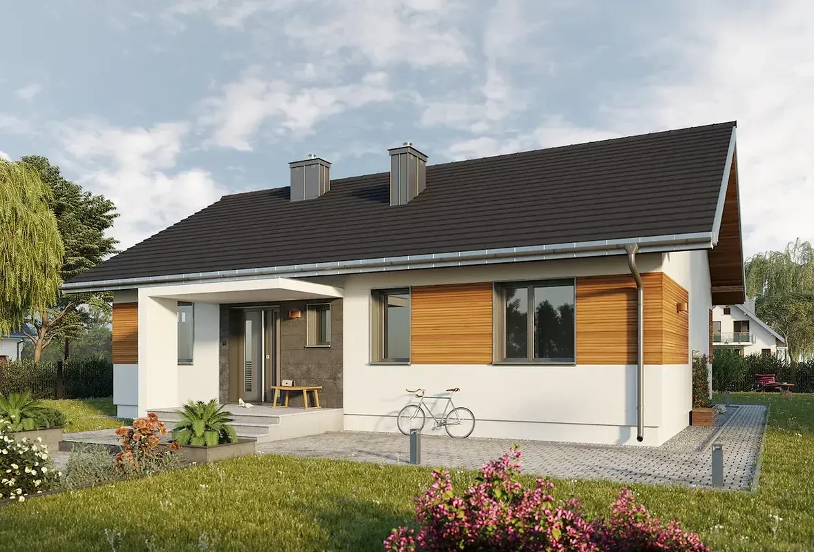Дом имеет простую форму, поэтому его строительство не потребует больших финансовых средств. Предложение для людей, у которых есть участок средней ширины.