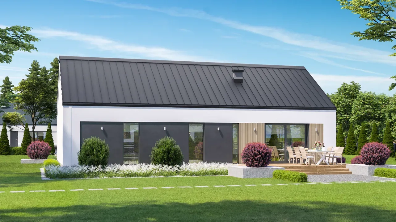 Одноэтажный проект дома имеет простую форму, двускатную крышу и открытую террасу. Несмотря на небольшую площадь, дом стал не только привлекательным снаружи, но и уютным и функциональным внутри. Грамотное планирование и дизайн позволили максимально эффективно использовать пространство, обеспечивая комфорт и удобство.