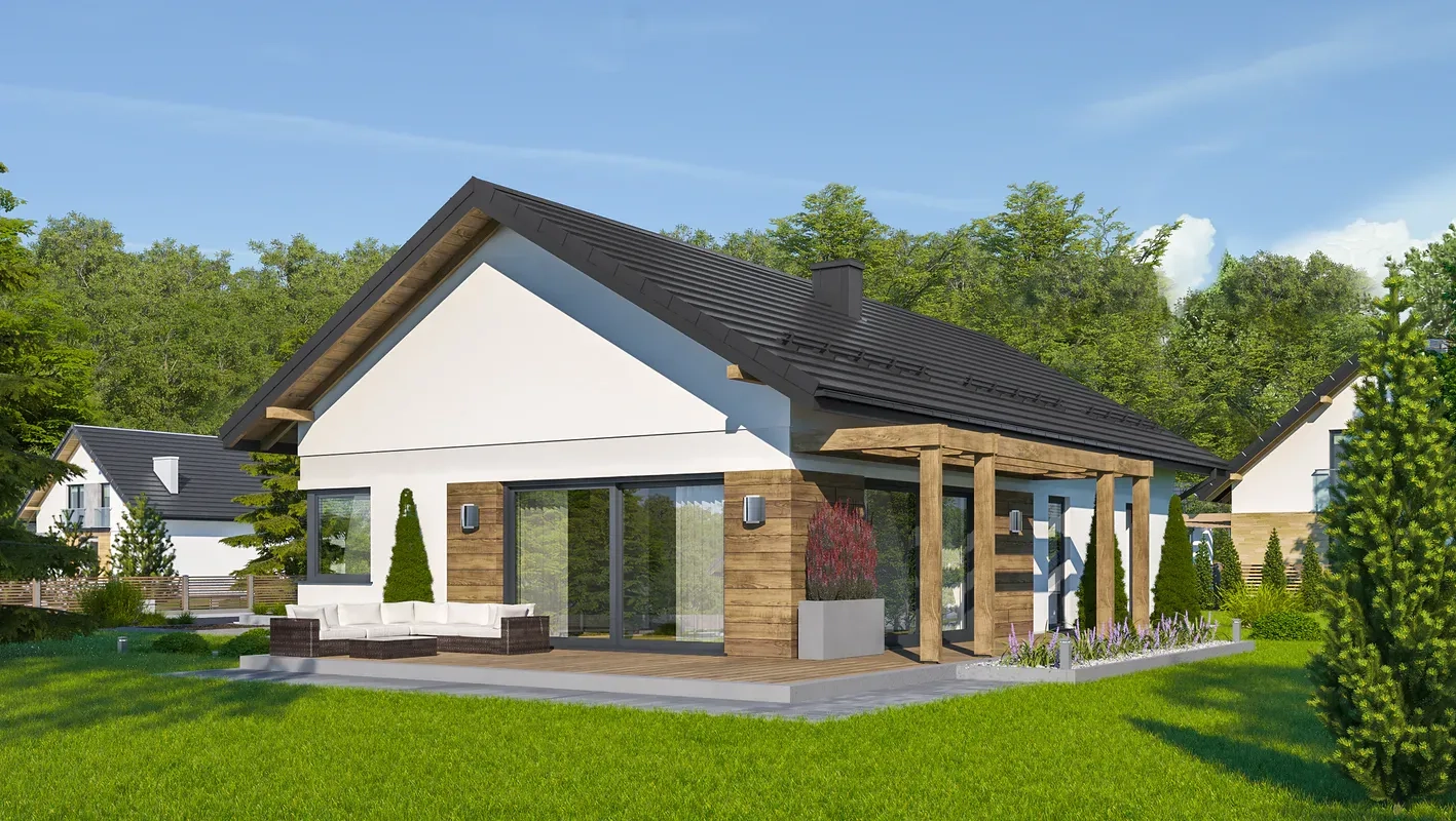 Проект одноэтажного дома простой формы с двухскатной крышей, покрытой керамической черепицей темно-серого цвета. Фасад дома преимущественного покрыт белой штукатуркой, вход дома выделен темно-серой декоративной штукатуркой. Справа от дома обустроена терраса с деревянным настилом, с этой стороны фасад облицован деревянными панелями. Сзади дома сделан навес из дерева, что защищает от излишнего солнечного света.