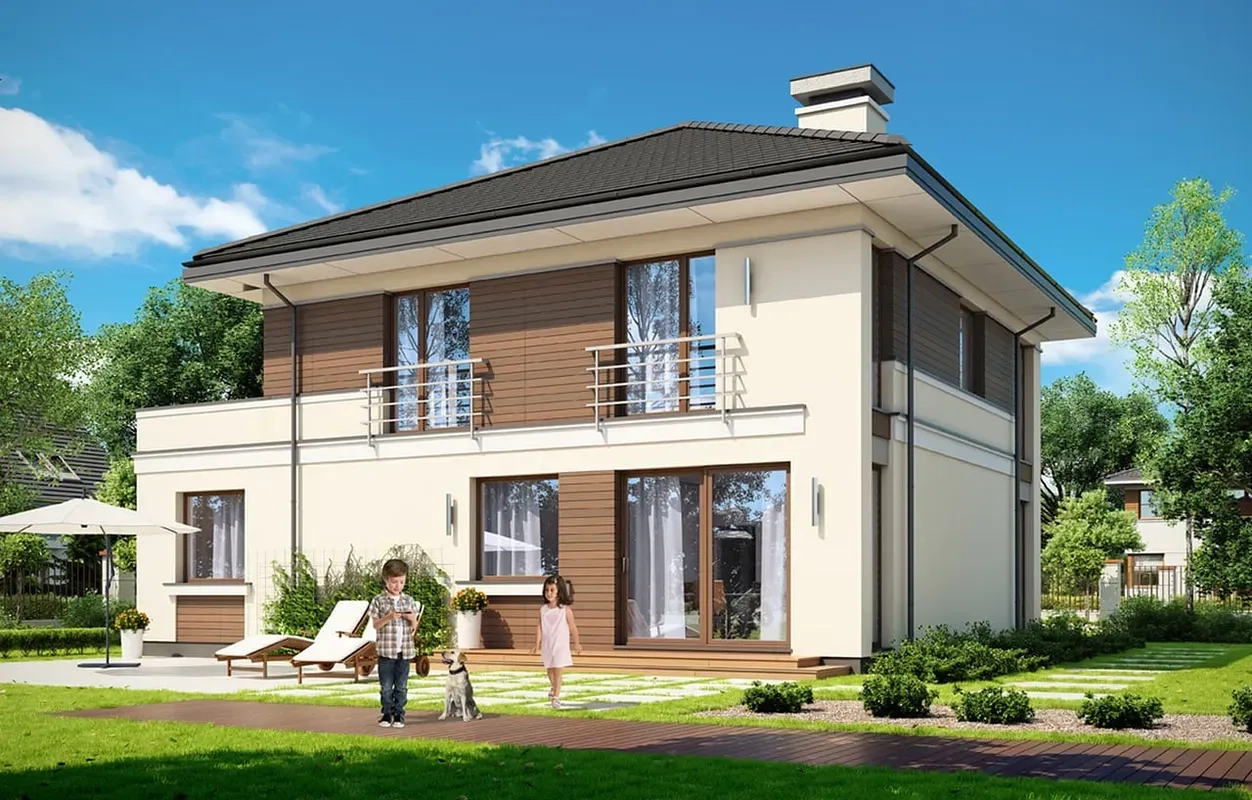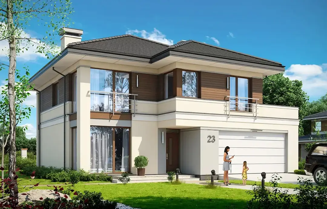 Проект современного двухэтажного дома с гаражом в стиле райт. Верхний этаж дома украшен деревянной облицовкой, в то время как нижний этаж окрашен в светлый тон декоративной штукатурки.