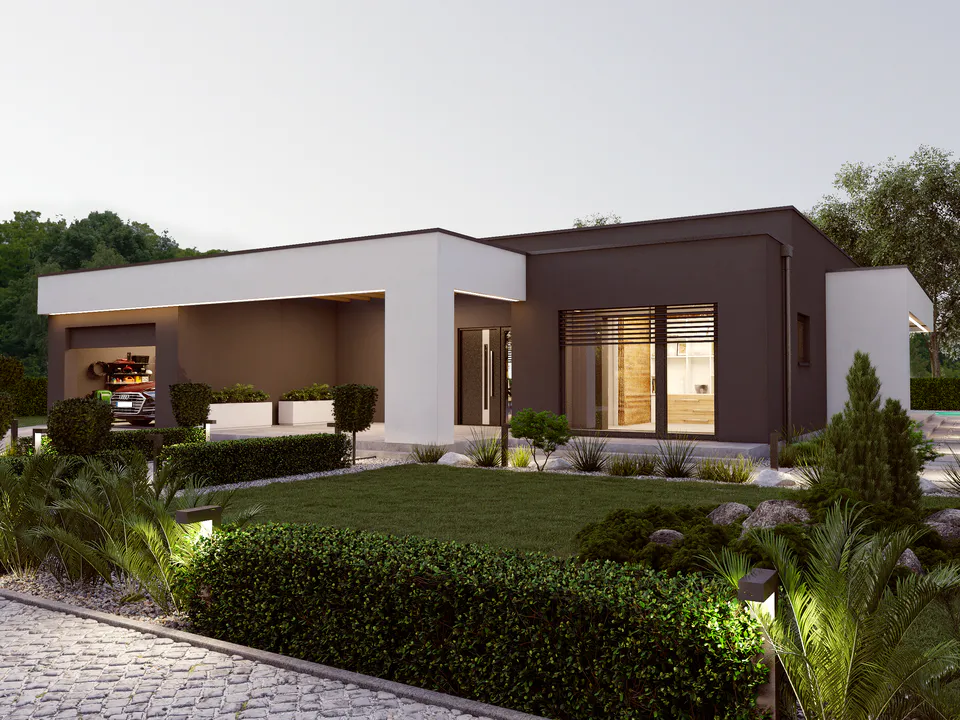 Дом в стиле райт сочетает в себе современность и традиционность, создавая комфортное и функциональное место для жизни. Фасад сочетает различные материалы и текстуры, чтобы создать уникальный и привлекательный вид.