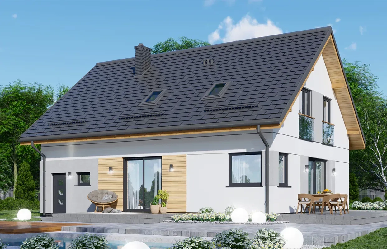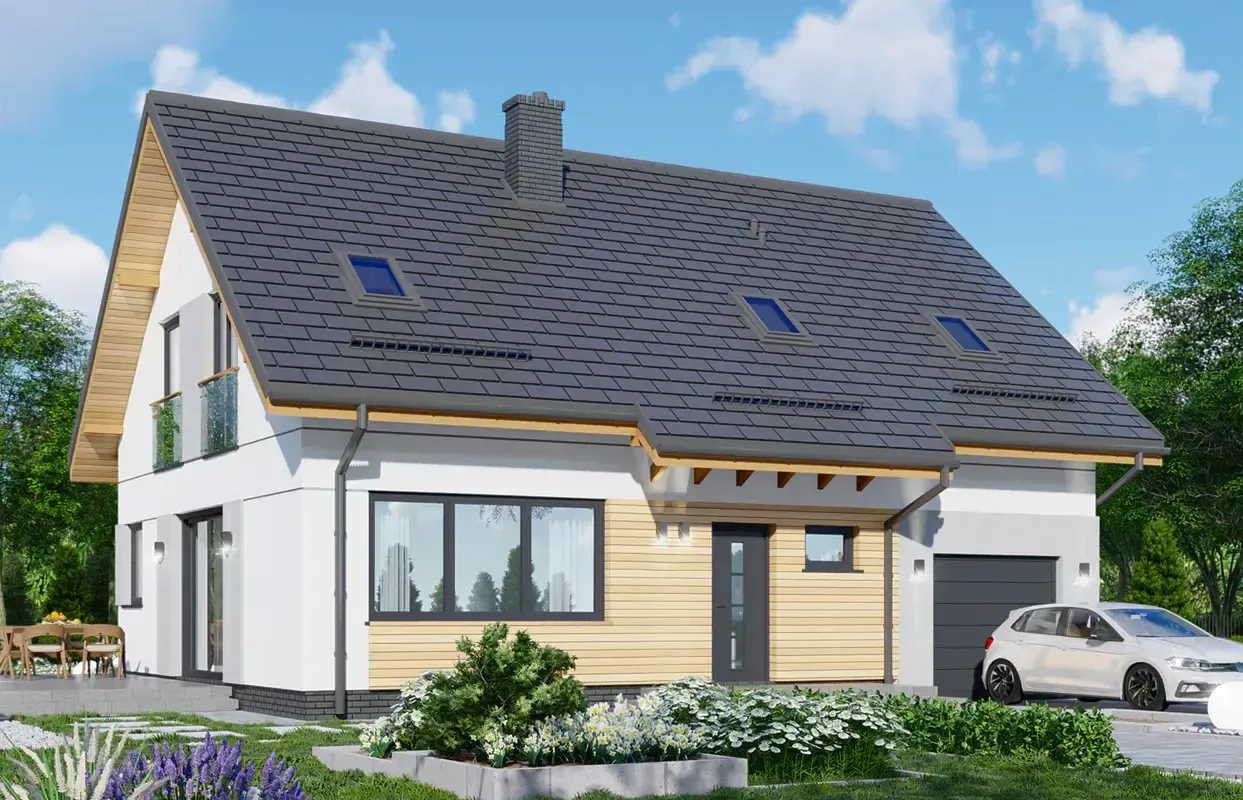 Фасад дома сочетает в себе белую штукатурку и элементы облицовки из светлого дерева. Дверь, гаражные ворота, оконные рамы и крыша имеют контрастный серый цвет, что добавляет стиль и элегантность общему виду дома.