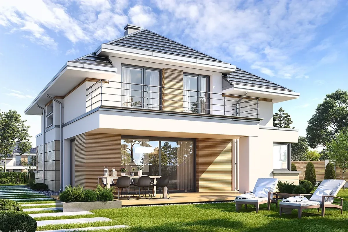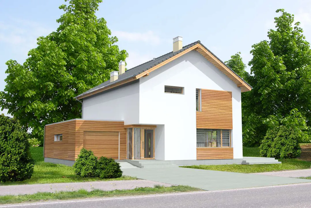 Проект современного двухэтажного дома с комбинированным фасадом, включающим белые гладкие стены и элементы с деревянной отделкой. Крыша дома четырехскатная, покрыта керамической черепицей. Слева от центрального входа расположен встроенный гараж с большими горизонтальными секционными воротами и плоской крышей.