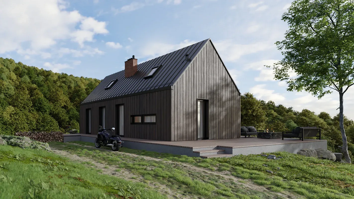 Проект небольшого дома с мансардным этажом и террасой. Дом имеет темно-серый деревянный фасад и двухскатную крышу с кровлей из фальцованных металлических листов.