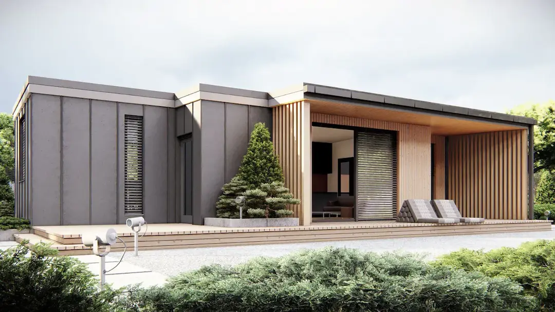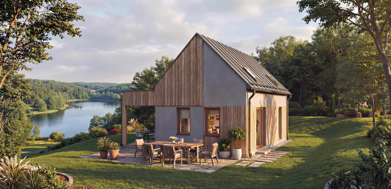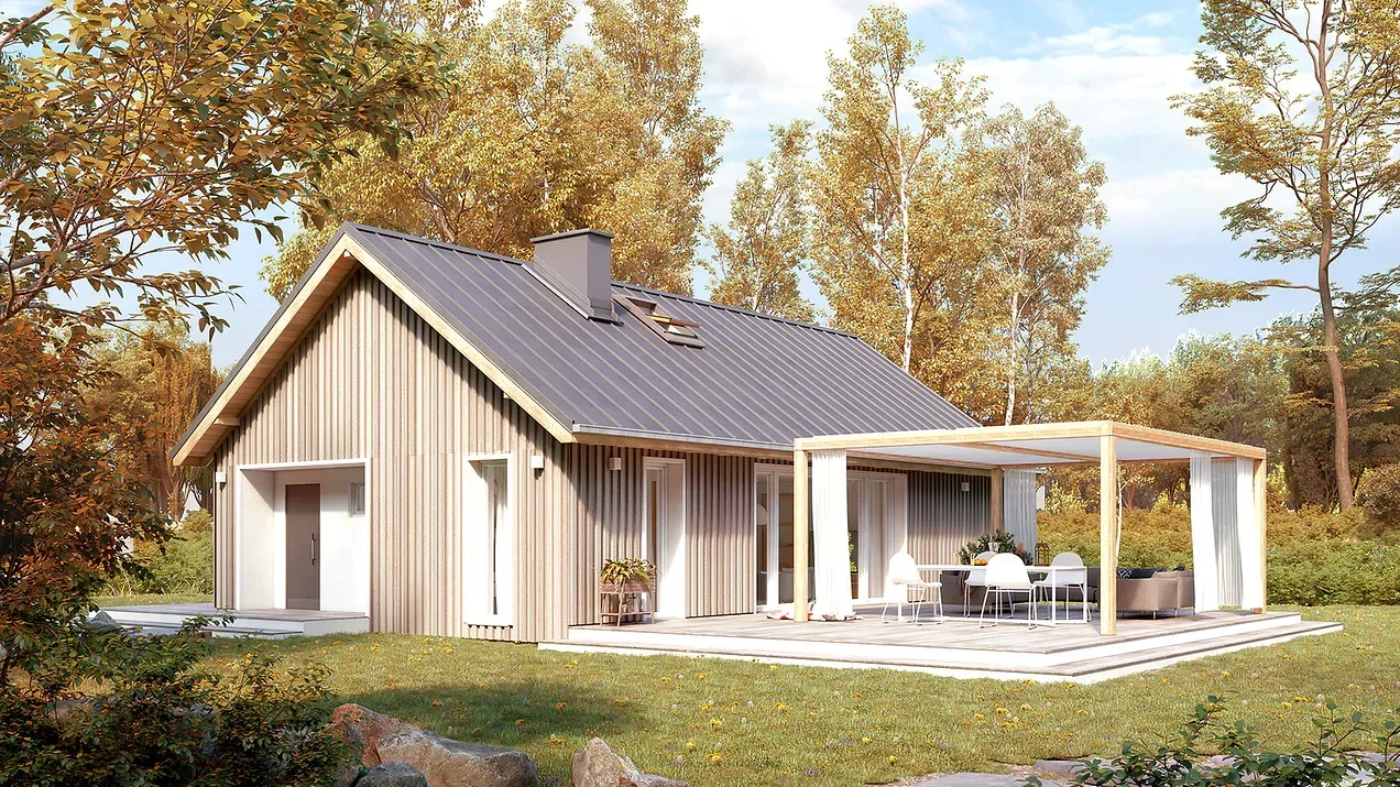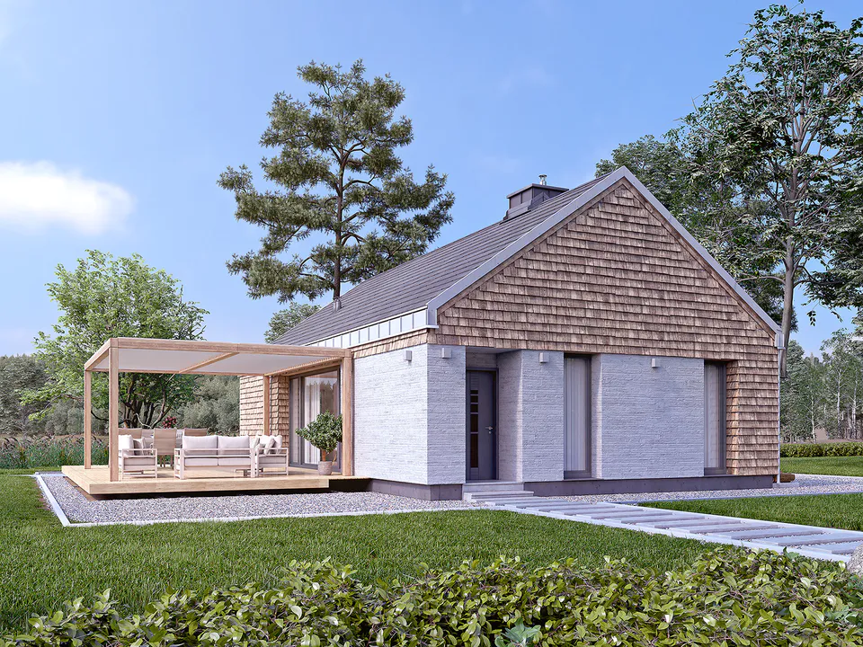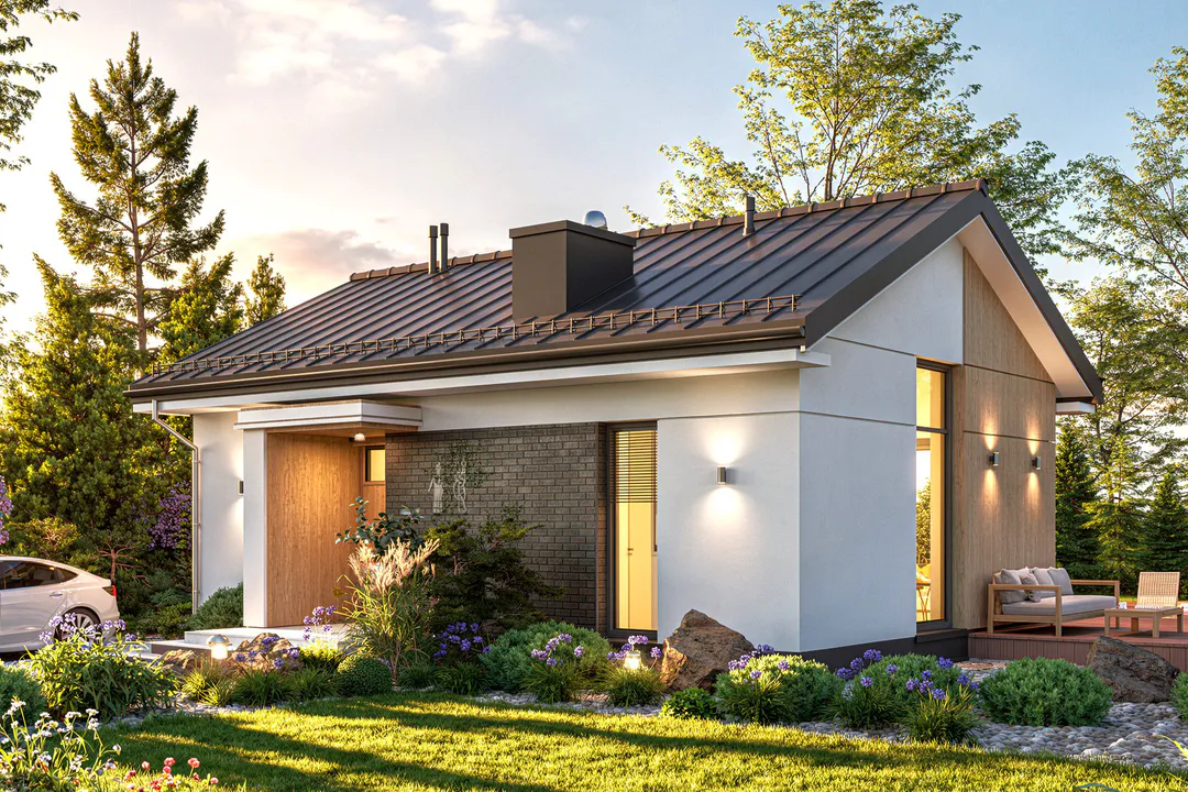 Компактная, современная форма с плоской крышей гарантирует быстрое строительство, а также низкие затраты на содержание дома.